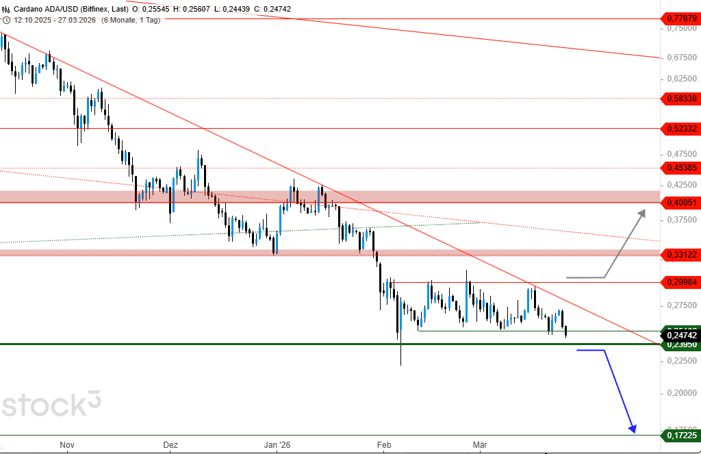 Retten kann Cardano hierbei nur ein positiver Aufwind mitsamt Sprung über den Widerstand von 0,30 US$. In diesem Fall wäre zugleich der Abwärtstrend seit Oktober 2025 beendet, sodass sich weitere Preissteigerungen bis 0,33 US$ und darüber in Richtung 0,40 US$ ereignen könnten.