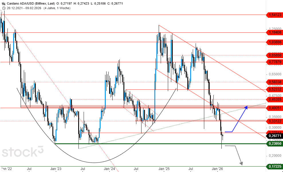 Der Wochenchart seit April 2022 zeigt die Bodenbildungsphase der Jahre 2023 bis 2024. Im Zuge der US-Wahl schoss Cardano dann auch deutlich empor und doch reichte es nicht für eine nachhaltige Stabilisierung über 1,25 US$. Der im Jahr 2025 eingeschlagene Abwärtsimpuls gewann im Anschluss an den Oktober-Crash weiter an Fahrt und so wurde erst in der Vorwoche das Unterstützungslevel von 0,24 US$ getestet.