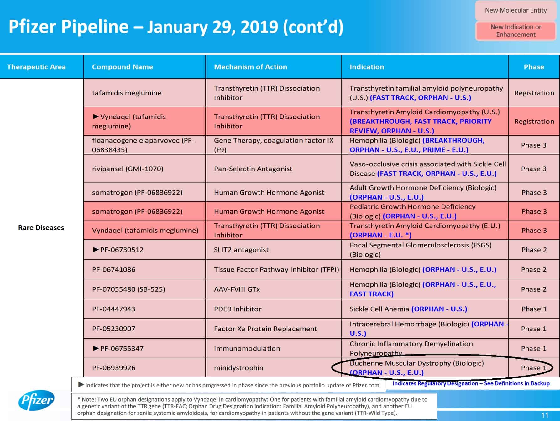 Ein bekannter Pharmariese - der größte der Welt - hat sich unter anderem auf seltene Erkrankungen (Rare Diseases) spezialisiert und ist insbesondere im DMD-Bereich intensiv engagiert. Die Rede ist von niemand Geringerem als Pfizer, das unter anderem als Hauptsponsor der DuchenneXchange sowie von CureDechenne auftritt. Blöd für den Konzern: Die klinisch fortgeschrittenste DMD-Entwicklung aus eigenem Hause scheiterte vor einigen Monaten in Phase 2. Nun hat man lediglich noch eine Gentherapie in sehr frühem Stadium in petto.
