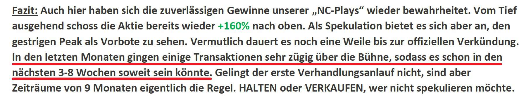 Nach dem Studienflop im Oktober blieb von Catabasis nicht viel mehr übrig als ein Börsenmantel mit noch einer guten Stange Geld. Als der Kurs am Boden lag und bis 1,25 USD durchgereicht wurde, spekulierte der No Brainer Club auf die Umsetzung wertsteigernder Maßnahmen in Form einer M&A-Transkation. Noch am 3. Dezember schrieben die NBC-Experten Folgendes: