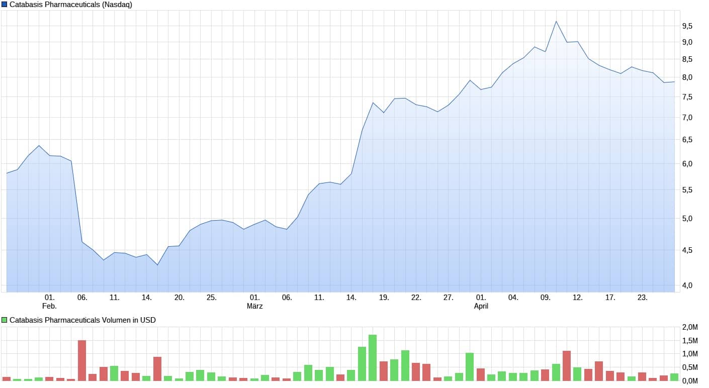 Bereits in circa zwei Wochen wird Catabasis seine Q1-Zahlen mitsamt Business Update präsentieren. Neue Dynamik im Vorfeld ist zu erwarten. Wir gehen davon aus, dass der Großteil der KE-Investoren (letzter Einstiegspreis 5 USD mit Warrants zu 6,25 USD) weiterhin längerfristig orientiert ist und auf den großen Wurf setzt. Gewinnmitnahmen dürften also nach wie vor eher mit vergleichsweise geringen Umsätzen erfolgen.