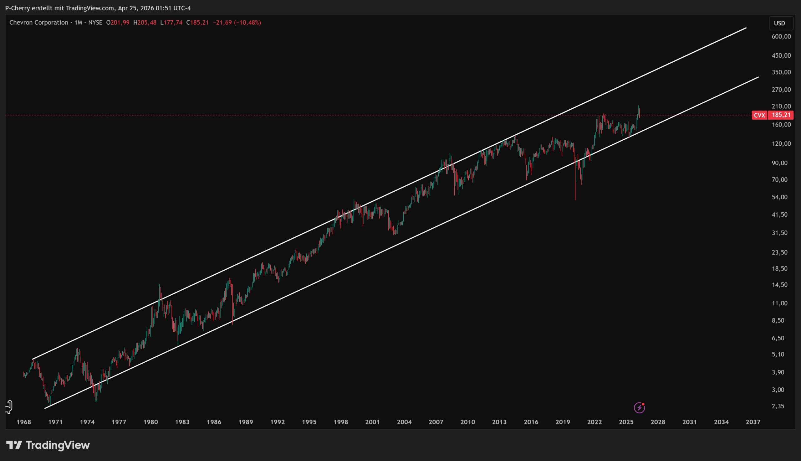 Der Chevron-Kurs zeigt im großen Chartbild auf Monatsbasis einen beeindruckenden Anstieg in einem aufwärtsgerichteten Trendkanal. Am 30. März erreichte dieser sogar ein neues Allzeithoch bei 214,71 US$. Daher ist der Rücksetzer von -14% in den letzten 4 Wochen tendenziell als Zwischenkorrektur einzuordnen, solange relevante Unterstützungen nicht brechen.