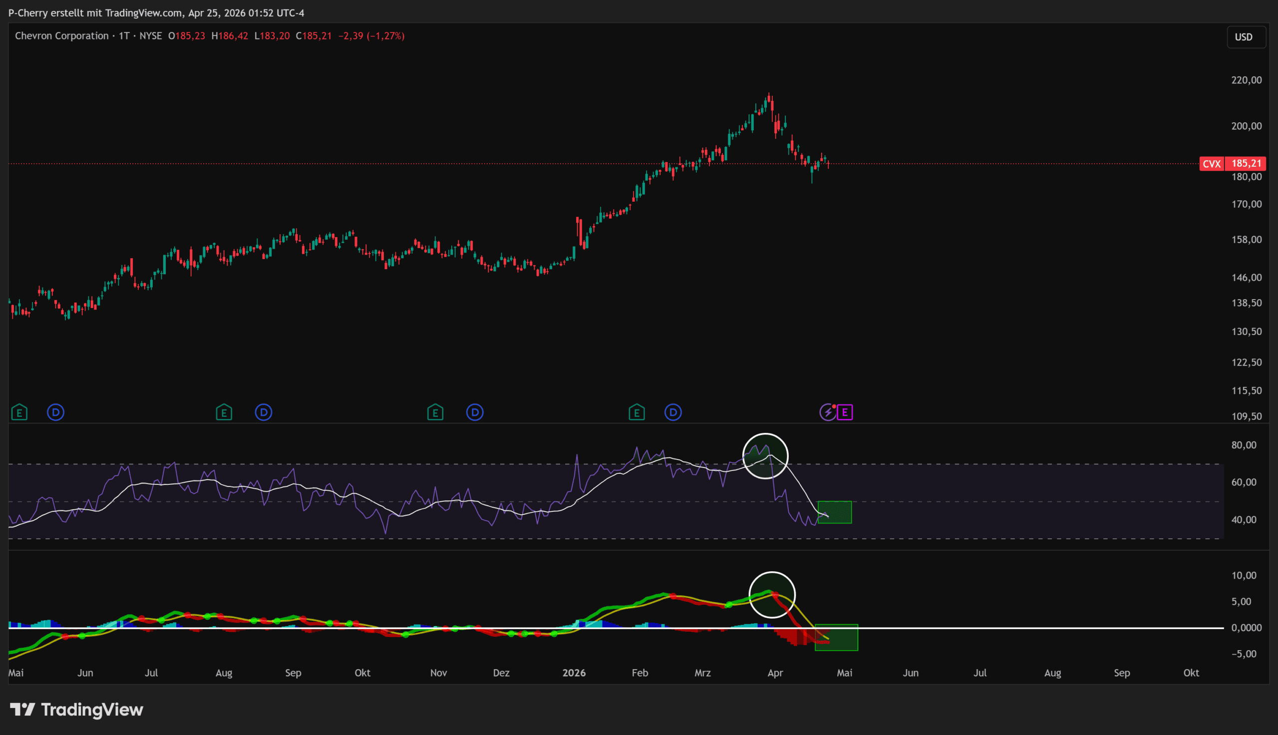 Die Indikatoren senden kurzfristig Schwächesignale. RSI und MACD haben im Tageschart bärische Crossover gebildet, zugleich nähern sich die Linien wieder an. Damit wirkt die Chevron-Aktie kurzfristig korrigierend, aber nicht klar angeschlagen.