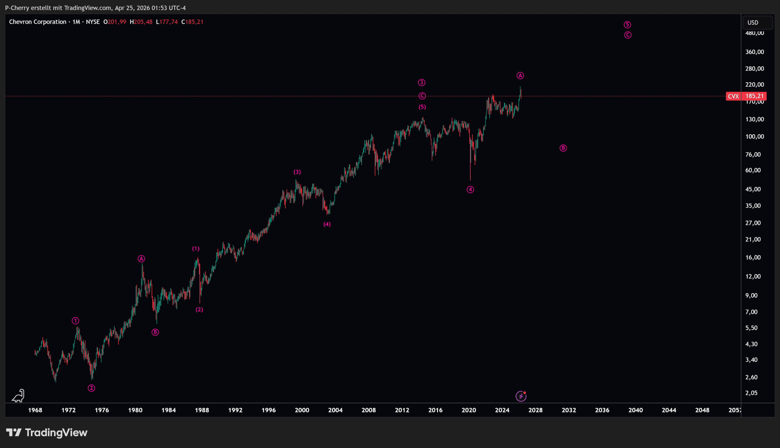 Der Chart der Chevron-Aktie zeigt auf Monatsbasis eine fortgeschrittene Struktur. Das Chartbild bewegt sich in einer diagonalen Struktur. Das bedeutet, dass die Bewegung aus dreiteiligen Mustern (A-B-C) besteht. Entsprechend könnte der Chevron-Kurs nun die A-Welle, der Welle 5 abgeschlossen haben und sich in einem Rücklauf in einer Welle B befinden.