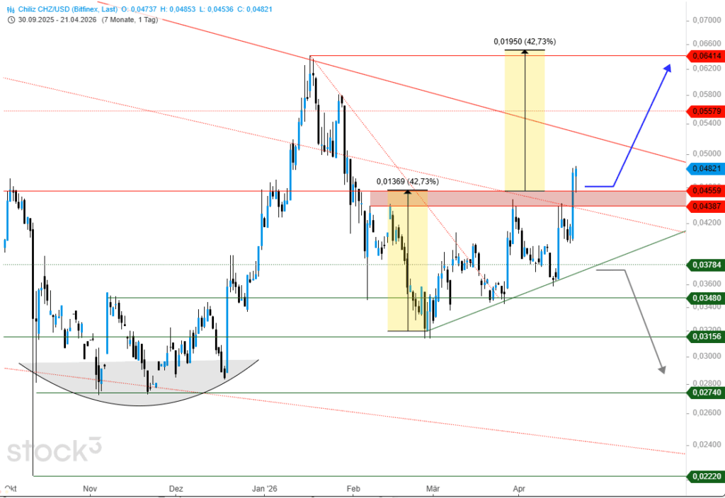 Bereits gestern vollzog Chiliz den Ausbruch über das Widerstandscluster von 0,044-0,046 US$. Mitsamt den heutigen Schwankungen, aktuell bereits wieder ins marginal positive Terrain gedreht, erreicht der Token dabei eine starke Performance von +21% seit Wochenbeginn. Doch damit nicht genug, denn durch den Ausbruch eröffnet sich weiteres Potenzial.