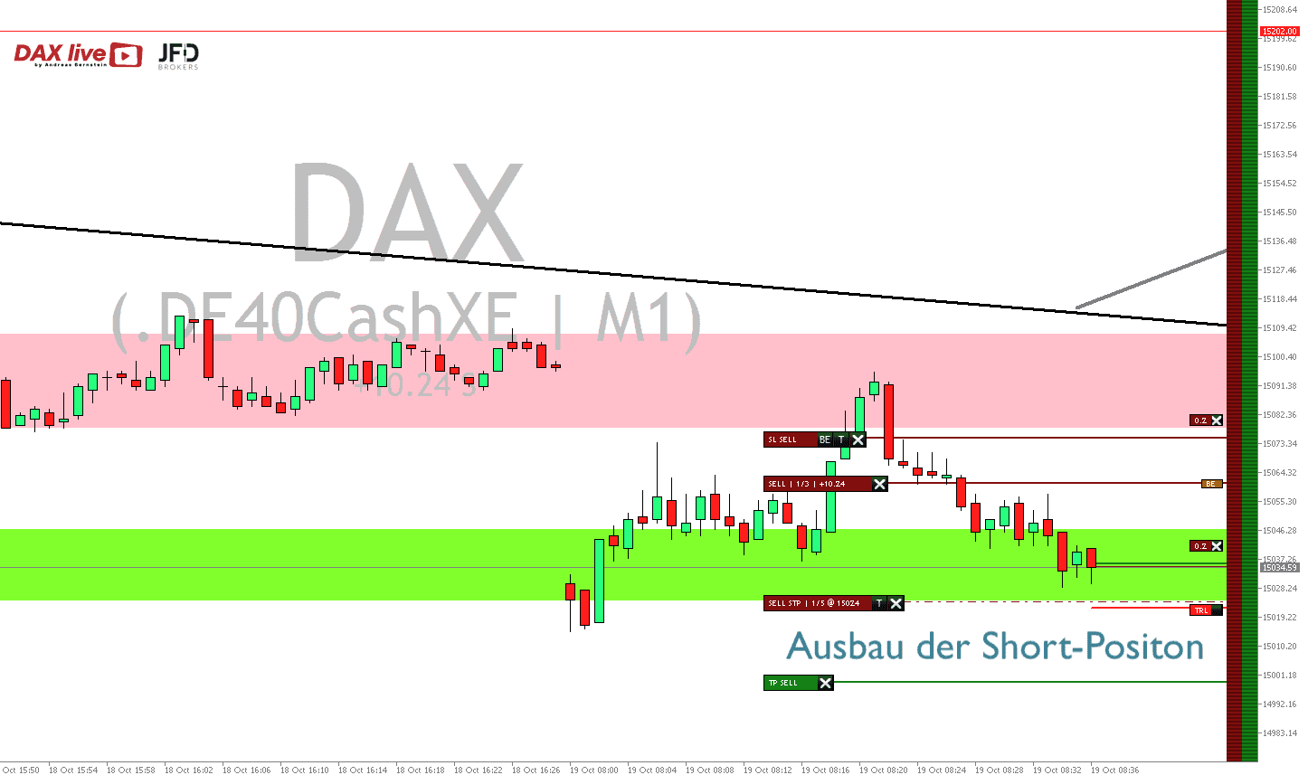 Angesichts der weiterhin unter Druck stehenden Märkte wurden die Trades am Donnerstag erneut short ausgerichtet. Los ging es auf Höhe der Vortagestiefs in Richtung des am Morgen geöffneten Gaps. In der Folge wurde der Stopp nachgezogen und die Position beim Tagestief weiter ausgebaut. Im Bereich der 15.000-Punkte-Marke wurde die Position mittels Take Profit und Gewinnen von bis zu 70 Punkten im Chat geschlossen.