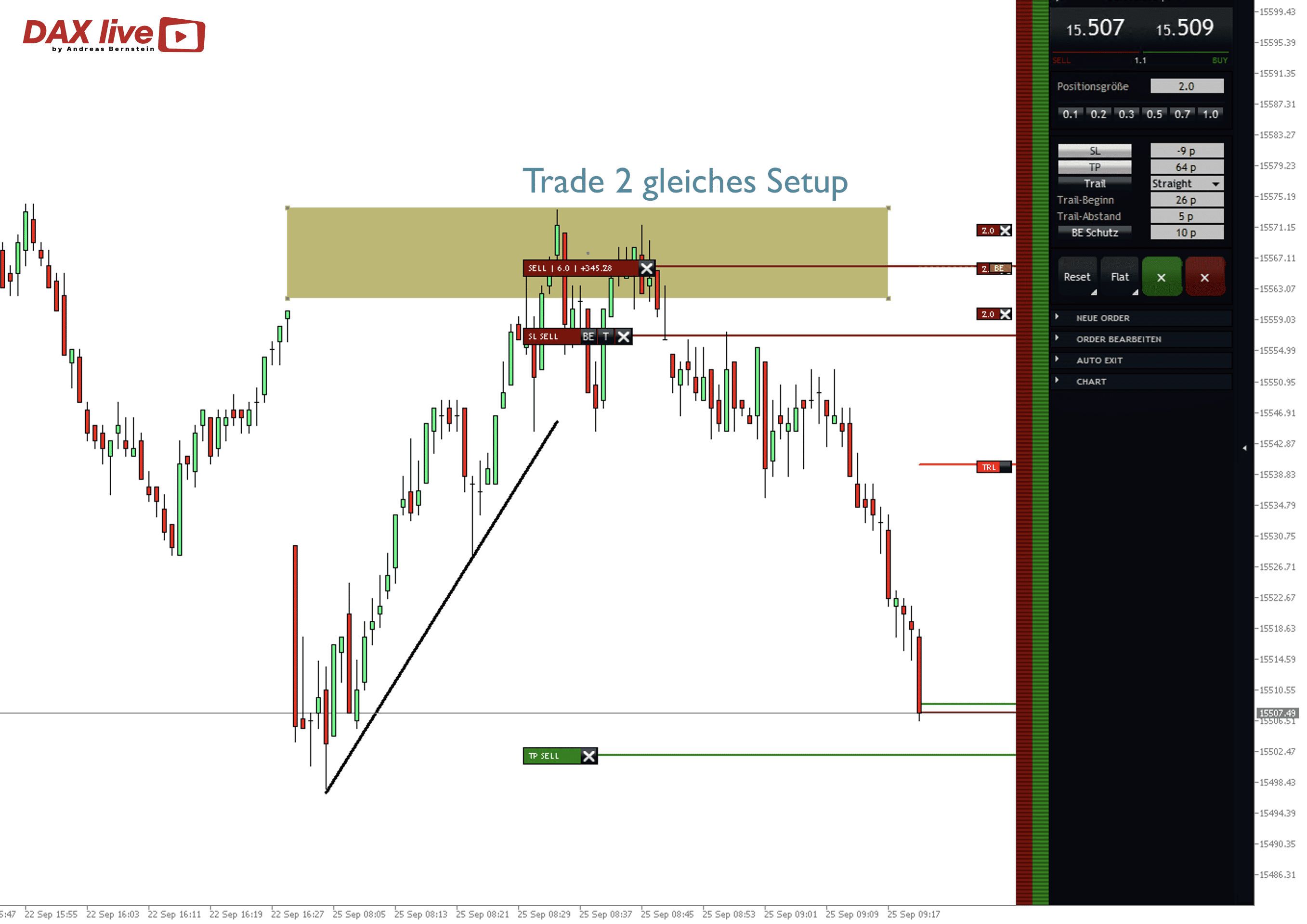 Am Montag eröffnete der DAX mit einem Abwärts-Gap in den Tag. Die erste Idee war den Index nach dem korrekt antizipierten Gap-Close auf der Short-Seite zu handeln, allerdings wurde dieser Trade durch einen zu engen Stoppkurs zunichte gemacht. Der zweite Trade auf der Short-Seite machte diesen kleineren Verlust aber mehr als wett und lief punktgenau ins erste Ziel bei 15.500 Punkten.