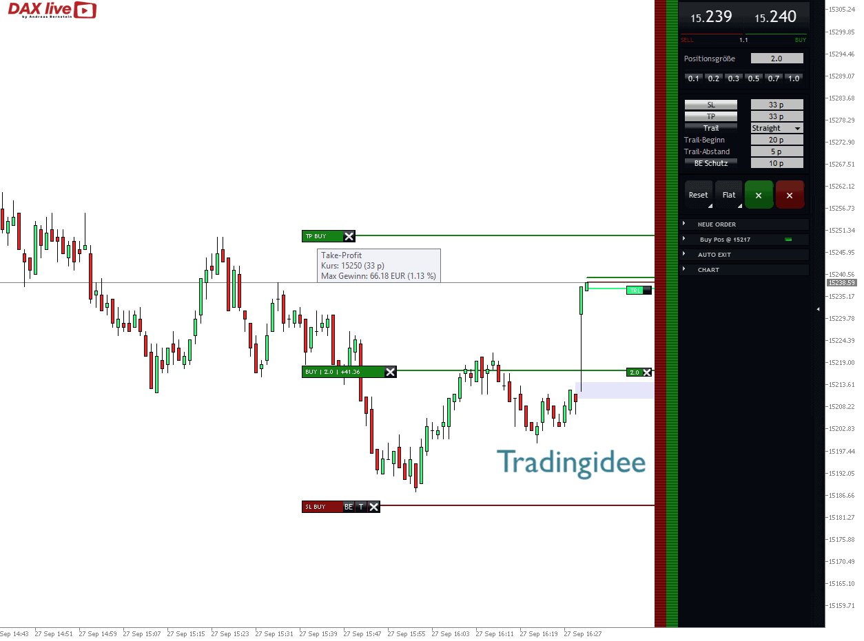 Auch am Mittwoch wurde trotz der negativen Markttendenzen auf eine Gegenbewegung spekuliert, weil bereits 5 Handelstage im Minus in Folge verzeichnet wurden, und der Trade long ausgerichtet. Die Idee dahinter: ein Einstieg knapp über der Marke von 15.200 Punkten. Nach einem Teilverkauf mit Gewinn wurde der zweite Trade mit Ziel Gap-Close aufrechterhalten und dort mit einem Plus von etwa 40 Punkten verkauft.