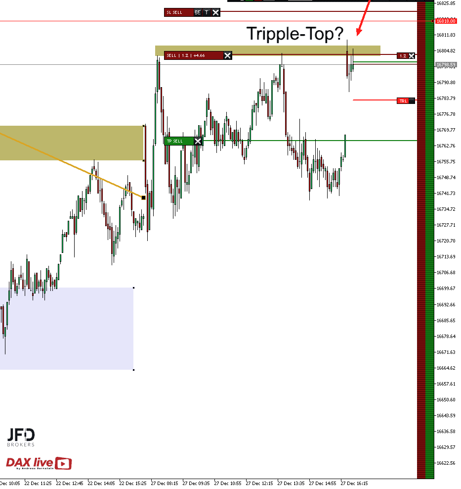 Am Donnerstag startete der DAX erneut höher in den Tag. Hier war es die Idee, mit einer Short-Position im Bereich der Vortageshochs zum Erfolg zu kommen. Der Trade lief gut an und in Richtung des Gaps. Der Stopp wurde in den Gewinn gezogen und die Teilnehmer per Push-Nachricht informiert. Ziel waren die Schlusskurse vom Mittwoch und damit ein Gap-Close. Dieses wurde auch erreicht und der Trade mit einem Gewinn von 40 Punkten glattgestellt.