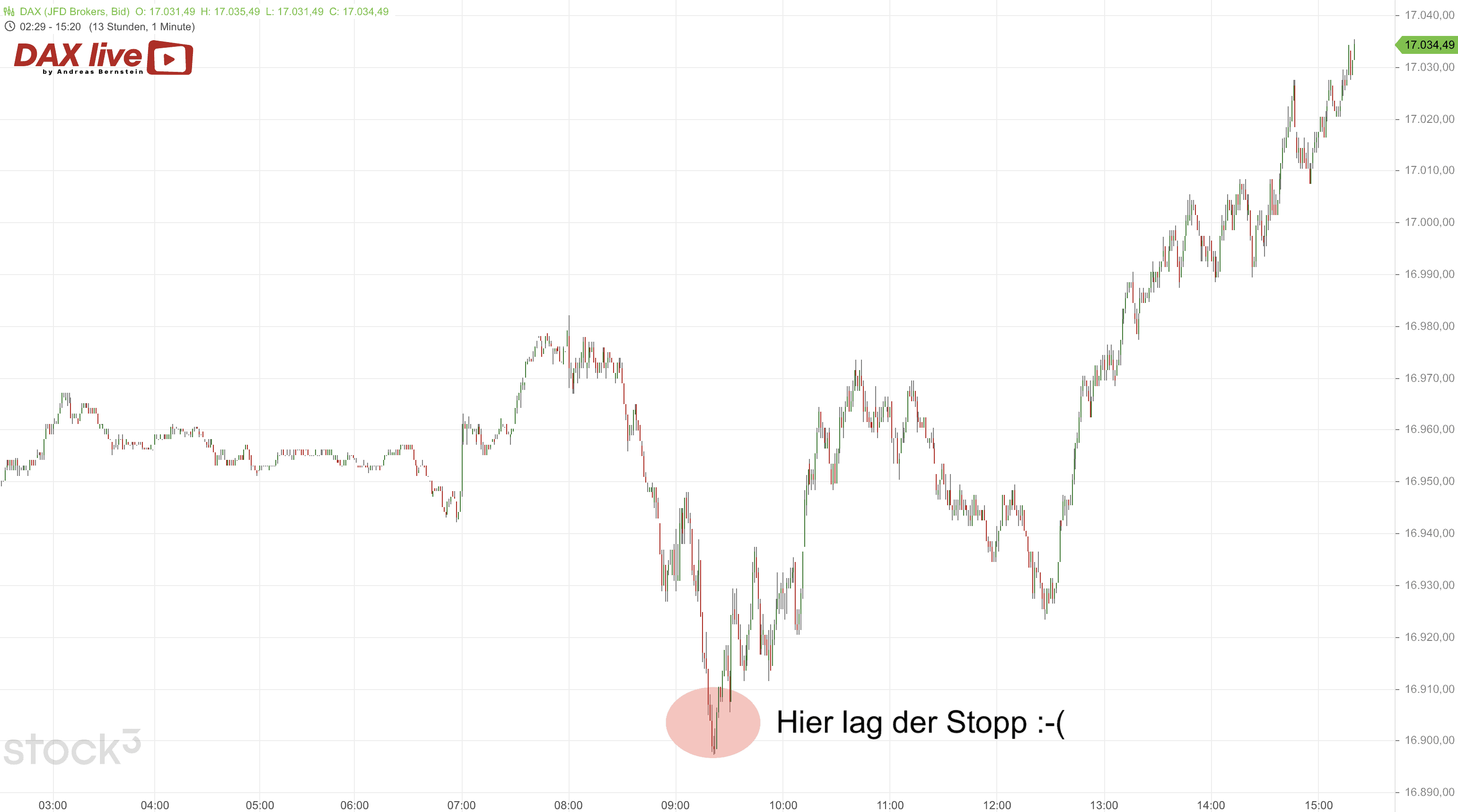Zum Abschluss der Woche startete der DAX abermals knapp unterhalb der 17.000-Punkte-Marke. Auf Höhe der Trendlinie, ausgehend vom Donnerstagstief, platzierte Andreas Bernstein eine Long-Order und eine Verkaufs-Order (Limit) beim morgendlichen Hoch von 16.985 Punkten.