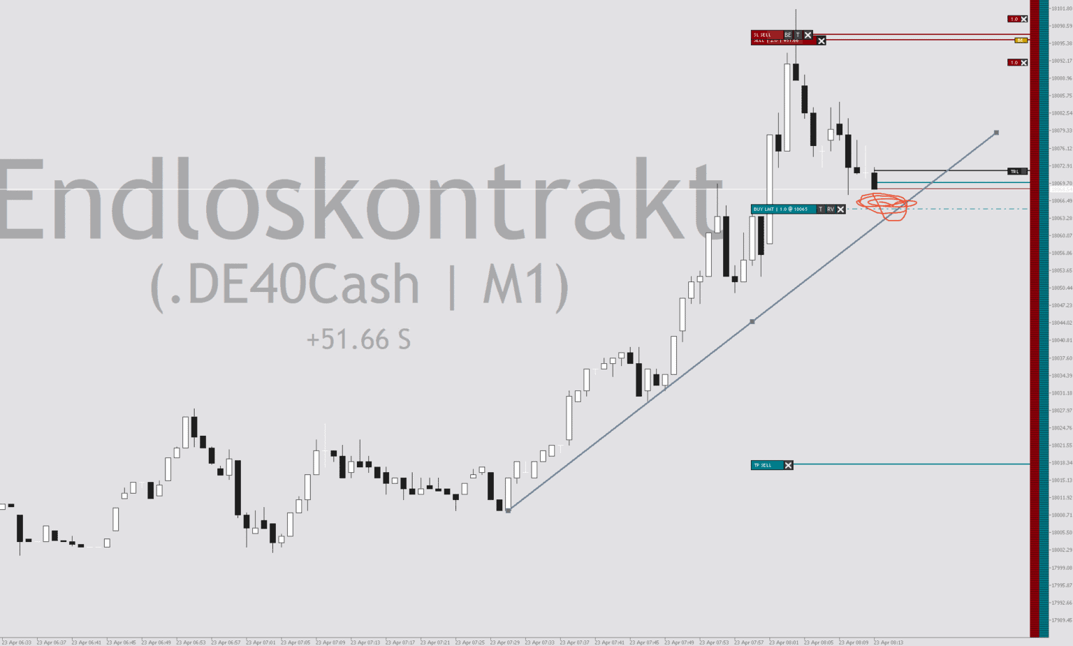 Deutlich besser lief es beim zweiten Short-Setup im Xetra-Bereich von 18.040 Punkten. Auf Höhe des kurzfristigen Aufwärtstrends im Endloskontrakt wurde ein Teilverkauf vorgenommen und für die Restposition der Stopp auf das Kaufniveau nachgezogen. Nach dem Bruch der Trendlinie und anschließendem Pullback fiel der Markt wieder zurück. Kurz vor dem Zielniveau wurde die Position manuell verkauft. In Summe ergab sich so ein Gewinn von über 80 Punkten.