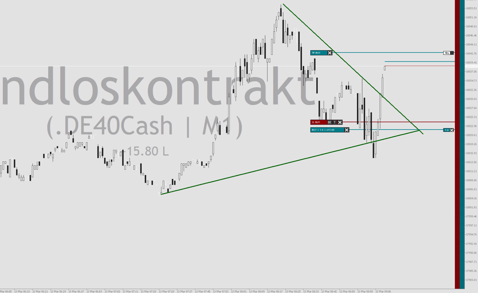 Am Mittwoch erkannte der Profi-Trader im Endloskontrakt vorbörslich eine Keilformation und spekulierte darauf, dass diese bullisch aufgelöst wird. Und er sollte Recht behalten. Der DAX brach im regulären Handel nach oben aus und überwand kurz darauf erstmals die 18.000-Punkte-Marke, die als Ziellevel auserkoren worden war. Der Stopp wurde zuvor in den Gewinn gezogen und die Position manuell geschlossen.