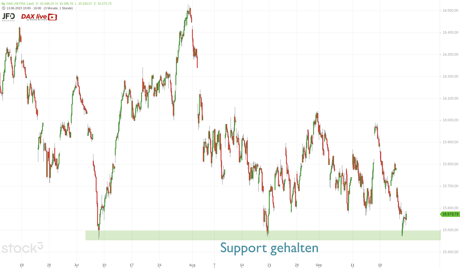 Nach einer Kurserholung an der Wall Street konnte der DAX auch im späten Handel wieder zulegen und behauptete sich somit über der wichtigen 200-Tage-Linie (SMA200). Die breite Handelsrage zwischen 15.500 und 16.000 Punkten hat damit weiterhin Bestand.