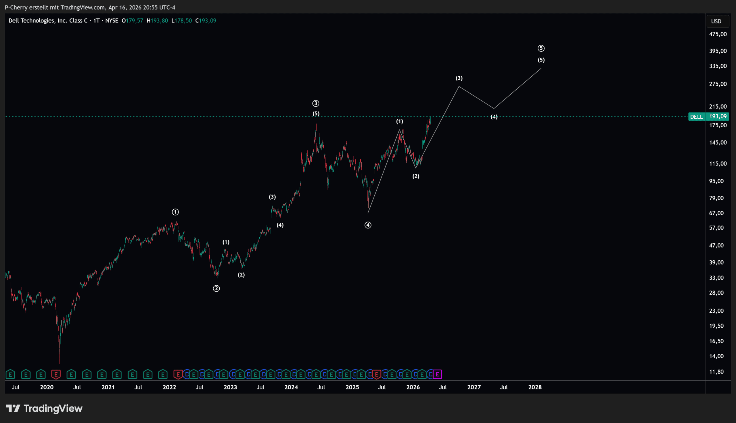 Der Dell-Kurs befindet sich nach wie vor in einem ungebrochenen Aufwärtstrend. Die Elliott-Wellen-Struktur suggeriert weitere Anstiege auch weit über die 200 US$-Marke hinaus.