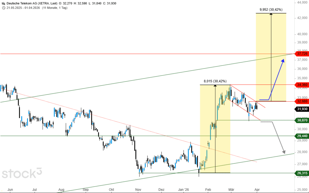 Seit Ende März befindet sich die Aktie der Deutschen Telekom in einer leichten Abwärts- beziehungsweise Konsolidierungsbewegung. Dies, nachdem vom Unterstützungsniveau bei 26,32 € zuvor ein starker Aufwärtsimpuls von +30% erfolgte. Interessanterweise deutet sich jedoch im Kontext einer Chartformation eine weitere Aufwärtsbewegung mit ähnlichem Potenzial an.