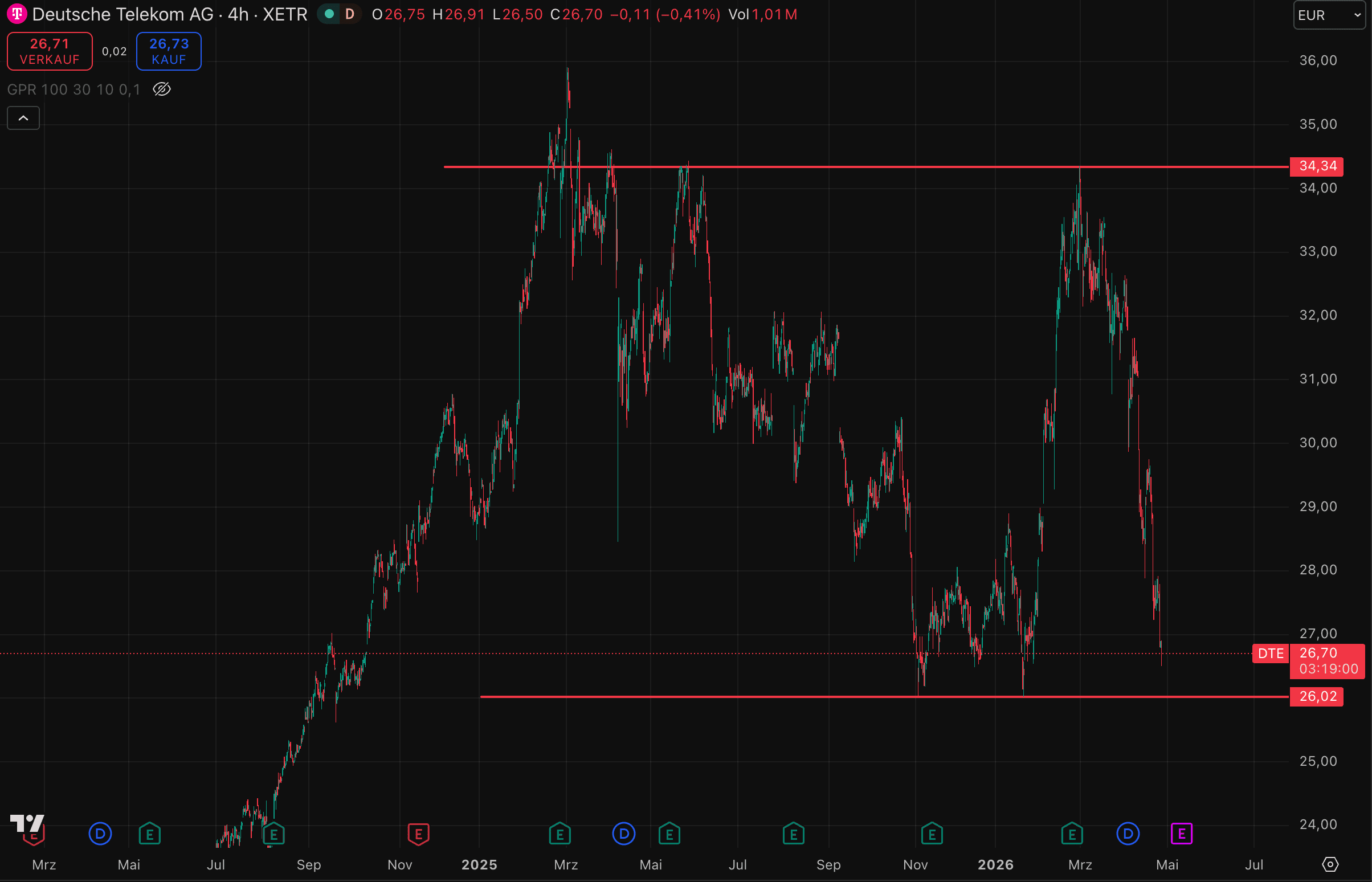 Der Blick richtet sich heute auf die Quartalszahlen von T-Mobile US, die nachbörslich veröffentlicht werden. Sie könnten kurzfristig darüber entscheiden, wie der Markt die aktuelle Schwäche einordnet. Fallen die Zahlen schwächer aus als erwartet, dürfte sich der Druck auf die Aktie der Deutsche Telekom weiter verstärken. In diesem Fall würde ein Test der Unterstützung im Bereich um 26 € wahrscheinlicher werden.
