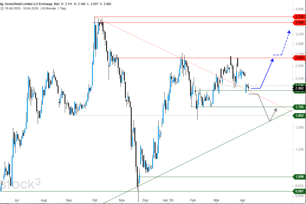 Die Aktie von DroneShield bleibt im Interesse der Anleger. Obgleich mit Blick auf den Chartverlauf seit der letzten Einschätzung vom 27. März die Kurse in einem grenzwertigen Umfeld verweilen. Faktisch notiert die Aktie kurz vor dem Wochenabschluss unter der Unterstützung von 2,12 €. Das buchstäbliche Wackeln der Bullen ist hierbei unübersehbar und weckt dennoch Interesse für die Möglichkeiten in der kommenden Woche sowie den darauffolgenden Wochen im Sinne einer dynamischen Erholungsbewegung.