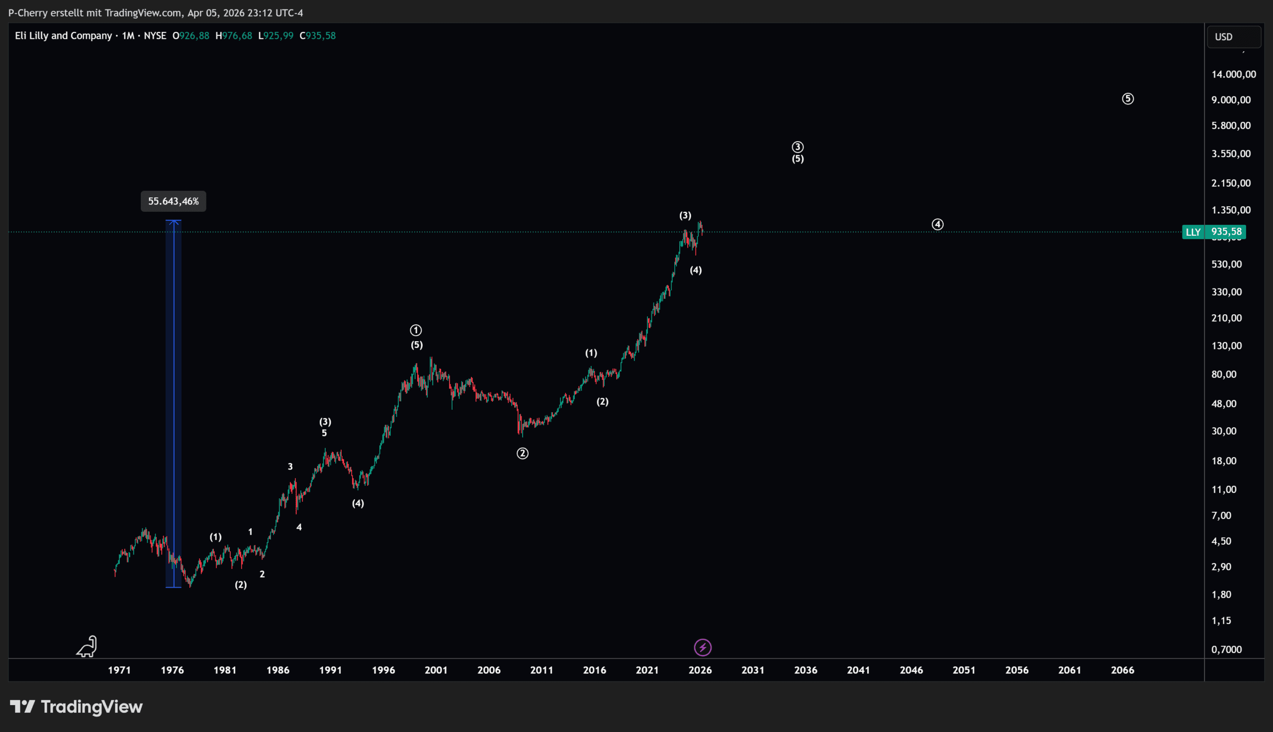 Die Elliott-Wellen-Analyse im Monatschart zeigt, dass sich der Eli Lilly-Kurs in einem sagenhaften Aufwärtstrend befindet, der mittlerweile 55.643 Prozent stark ist. Aktuell befindet sich der Kurs im Ausbau einer Welle 5, einer übergeordneten Welle 3.