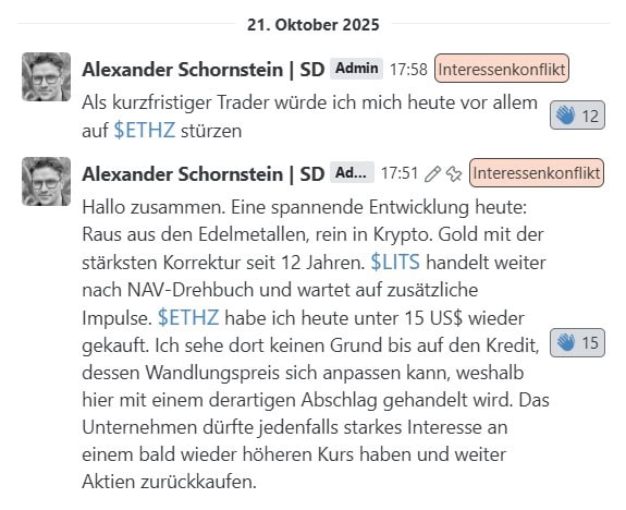 Nach vollzogenem Reverse Split handelte die Ethereum-Treasury ETHZilla zu Beginn letzter Woche zeitweise unter der Marke von 15,00 US$ und damit mehr als 40% unter ihrem Net Asset Value. Während Leerverkäufer die fundamentalen Gegebenheiten scheinbar aus dem Blick ließen, nutzten wir die Gunst der Stunde um Aktienpakete für einen kurzfristigen Trade zu akkumulieren. Am 21. Oktober gab es für unsere Community folgende Ansage meinerseits: