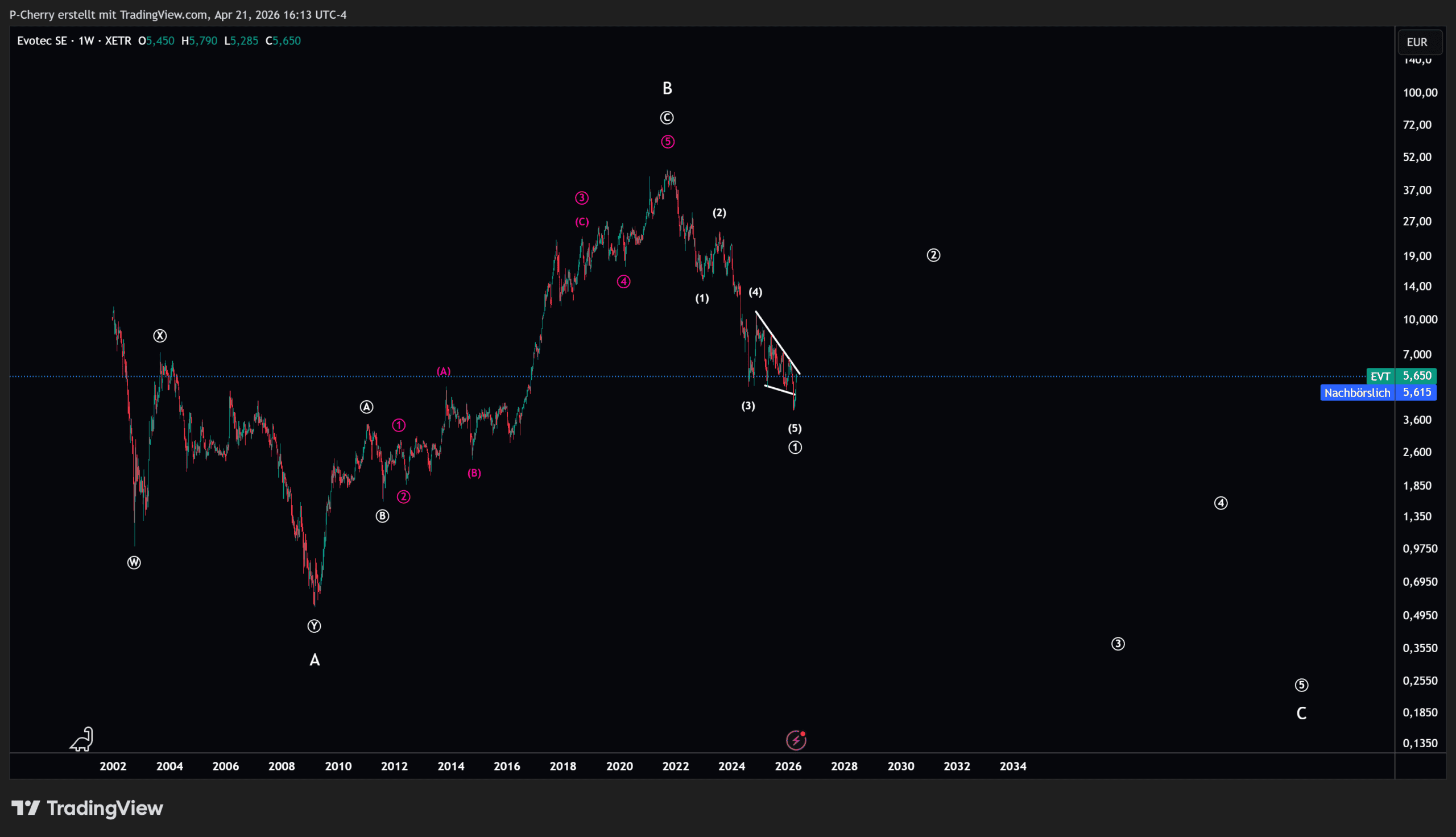 Im Wochenchart der Evotec-Aktie zeigt sich eine klare bärische Gesamtstruktur. Seit der Topbildung im November 2021 befindet sich der Kurs in einer anhaltenden, impulsiven Abwärtsbewegung in fünf Wellen.