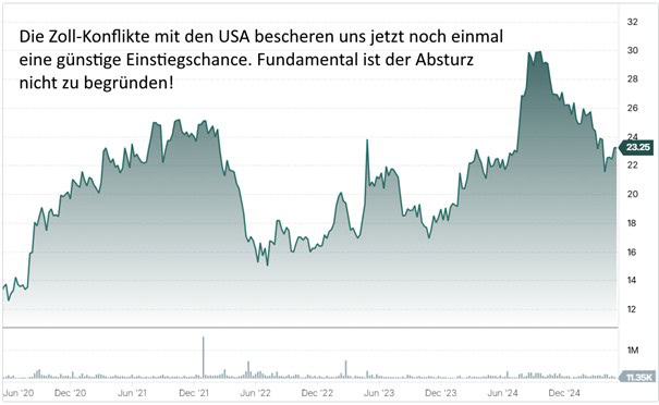 Eigentlich war mir die Aktie auf meiner Watchlist schon enteilt. Da ich mir so etwas aber nicht bieten lasse, habe ich meinen Kumpel Donald Trump angerufen, der kurzerhand einen Zollstreit mit dem nördlichen Nachbarn Kanada anzettelte.