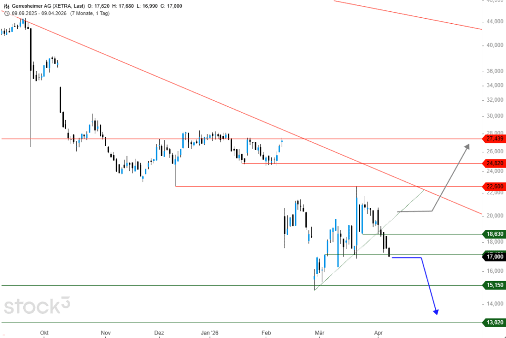 Durch den Bruch der kurzfristigen Aufwärtstrendlinie seit Ende Februar wurde bereits in der Vorwoche die Wiederaufnahme der übergeordneten Abwärtsbewegung generiert. Die zusätzliche Bestätigung erfolgte am heutigen Donnerstag durch die Unterschreitung der Unterstützung von 17,15 € per Tagesschluss. Dementsprechend erlauben sich mindestens weitere -10%, um die Unterstützung von 15,15 € anzusteuern. Gelingt auch dort keine Stabilisierung, droht eine Ausdehnung der Verlustserie in Richtung von 13 € je Anteilsschein.