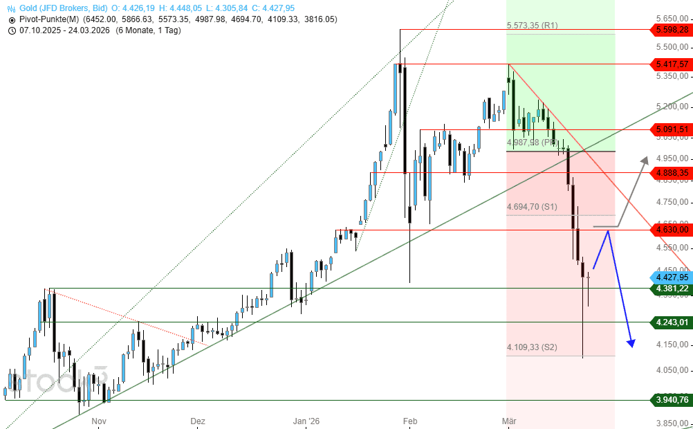 Ein Tagesschlussstand über 4.360 US$ könnte andererseits weiteres Kaufinteresse schüren. Zumindest dürften die Bullen ihre Chance wittern, was kurzfristig für weiteres Erholungspotenzial bis 4.888 US$ sprechen würde. Oberhalb von 4.900 US$ wäre wiederum der Abwärtstrend beendet.
