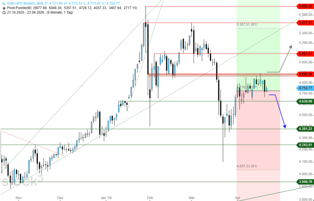 Mit dem Start in den April baute der Goldpreis seine Erholungsbewegung vom März-Ausverkauf weiter aus. Diese führte bis zum Widerstand von 4.888 US$, wo der Preis am vergangenen Freitag bereits eine Abweisung erfuhr. Soweit stabil, erfuhr Gold während des gestrigen US-Handels dann jedoch einen kräftigen Rückschlag, welcher zurück bis zum Eröffnungspreis von Anfang April führte.