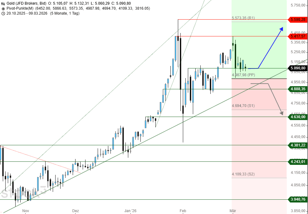 Schließt der Goldpreis hingegen deutlich unterhalb von 5.092 US$, gilt es auf den Monats-Pivot-Punkt bei 4.988 US$ zu achten. Nahe diesem verläuft auch die Aufwärtstrendlinie seit September 2025 und bietet den letzten Unterstützungsbereich vor einem deutlicheren Abverkauf in Richtung des Levels von 4.630 US$.