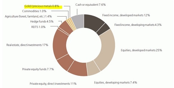 Nur mit 0,8 Prozent ist Gold in den Portfolios der Reichen gewichtet. Die Portfolios aus den Eigentümerfamilien zeigen aktuell durchschnittlich diese Anteile: