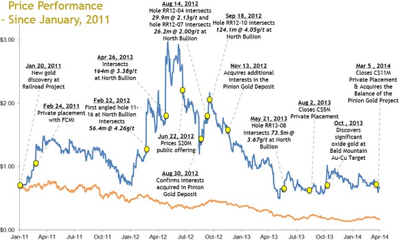 Hauptfokus von Gold Standard Ventures ist das "Railroad/Pinion"-Projekt mitten im sogenannten "Carlin Trend" im Nordosten Nevadas. Diese Goldregion zählt nicht ohne Grund zu den besten der Welt: Fast 100 Millionen Unzen Gold wurden durch Minen im Carlin Trend mittlerweile gefördert; allein 2012 waren es 5,6 Millionen Unzen und damit satte 75% der gesamten US-Goldproduktion! Der Carlin Trend zeichnet sich durch eine ideale Infrastruktur und eine sichere Jurisdiktion aus. Kein Wunder, dass auch die Gold-Riesen Newmont und Barrick hier ihre Mega-Minen stehen haben, um von den optimalen Bedingungen zu profitieren. Gold Standard konnte seine Explorationskonzessionen im Zielgebiet zuletzt nochmals deutlich auf beeindruckende 102 Quadratkilometer erweitern und besitzt nun auch 100% Eigentum an der außergewöhnlich verheißungsvollen "Pinion"-Lagerstätte mit einem weiteren Millionen-Unzen-Potenzial.