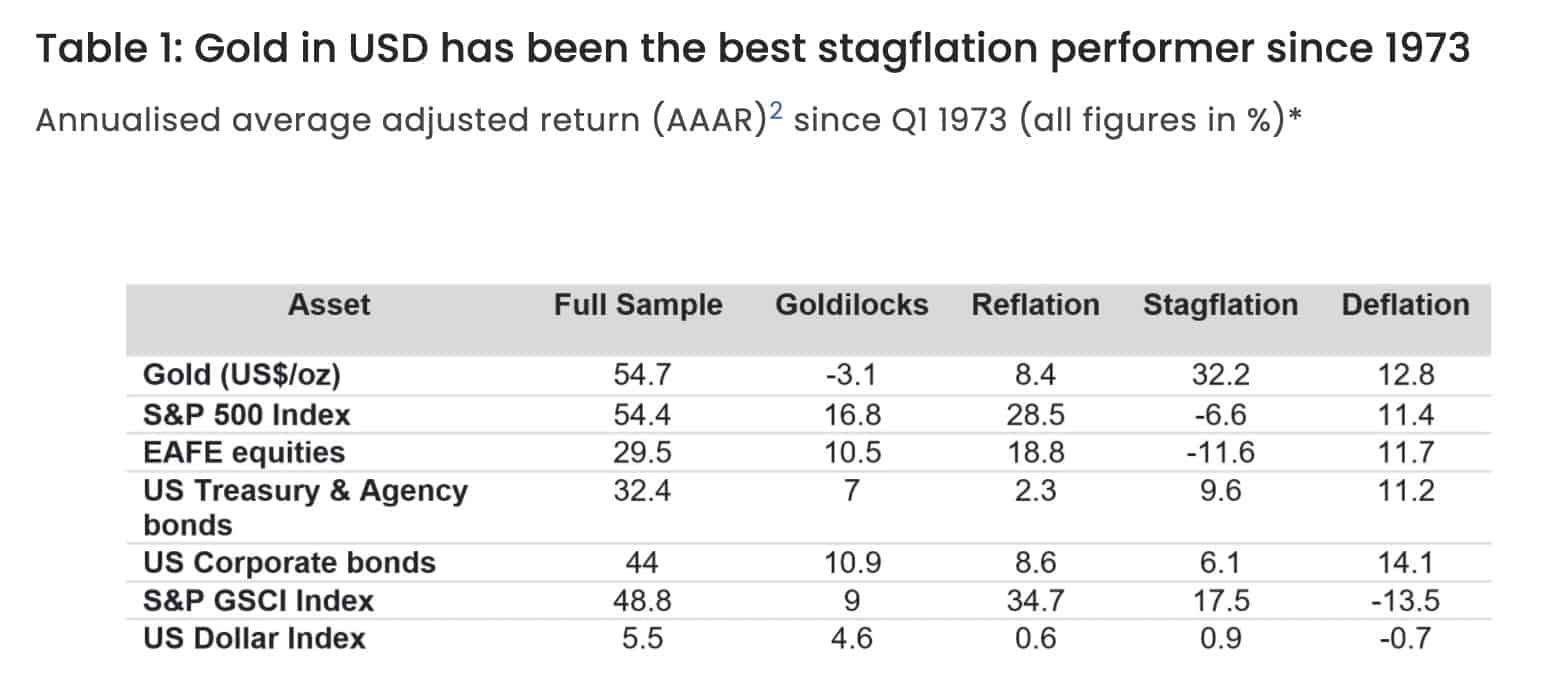 Zudem schneidet Gold, laut Aussagen des World Gold Council, in der Stagflation – also bei hohen Inflations- und niedrigen Wachstumsraten – unter allen Anlageklassen am besten ab.
