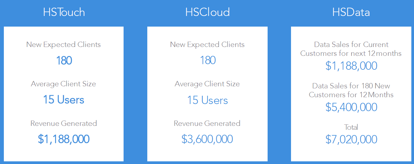 Entsprechende Datensätze sind nach Angaben des Unternehmens je Fall 7 bis 10 US$ wert und können mehrfach an verschiedene Kunden verkauft werden. Eine echte Cashmaschine. Um den Verkauf von Datensätzen so bald wie möglich anzukurbeln, wurde ein Senior-Account-Manager vom Software-Riesen SAP abgeworben, der bereits Millionen-Umsätze in diesem Geschäftszweig generiert hat.