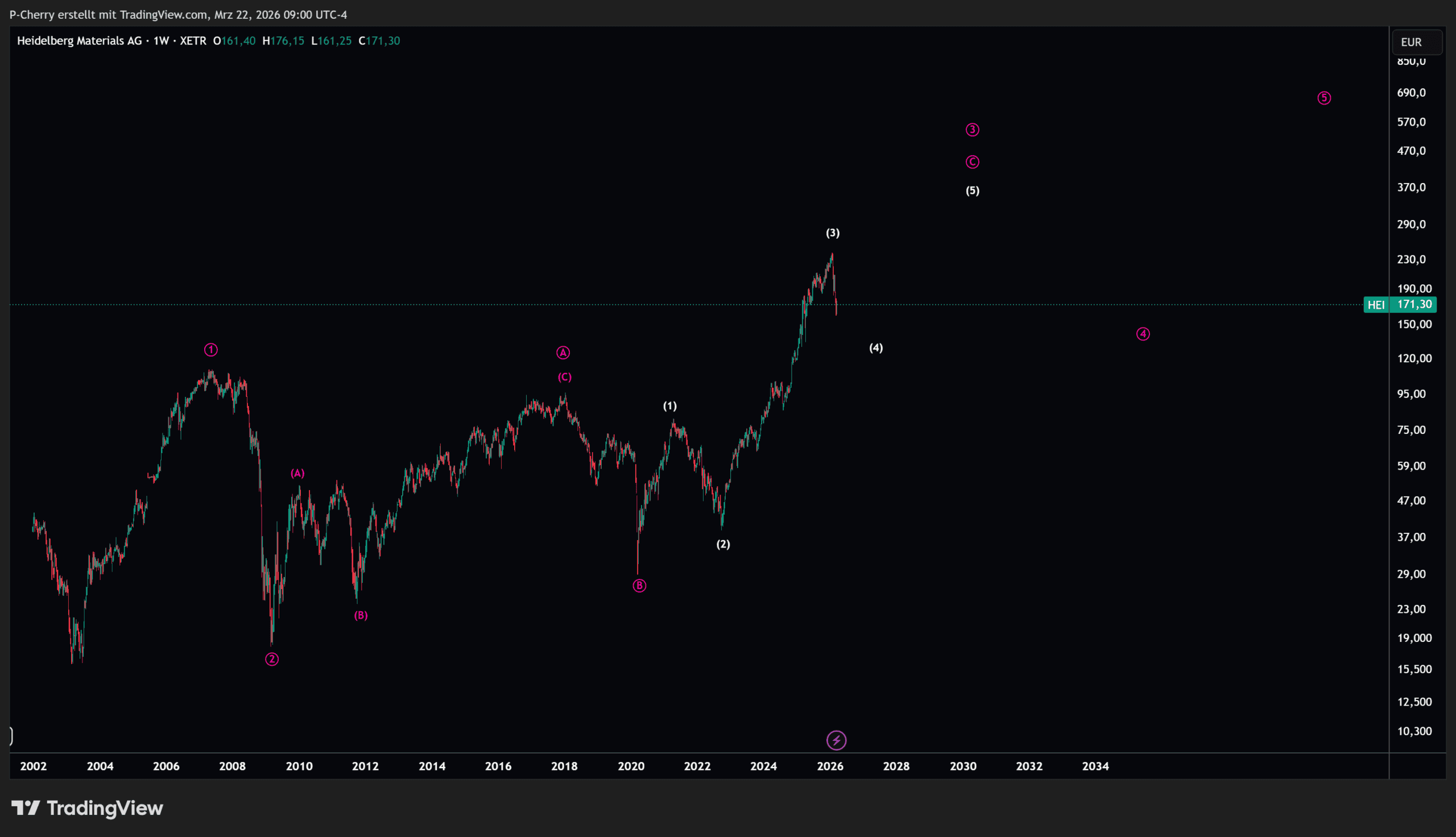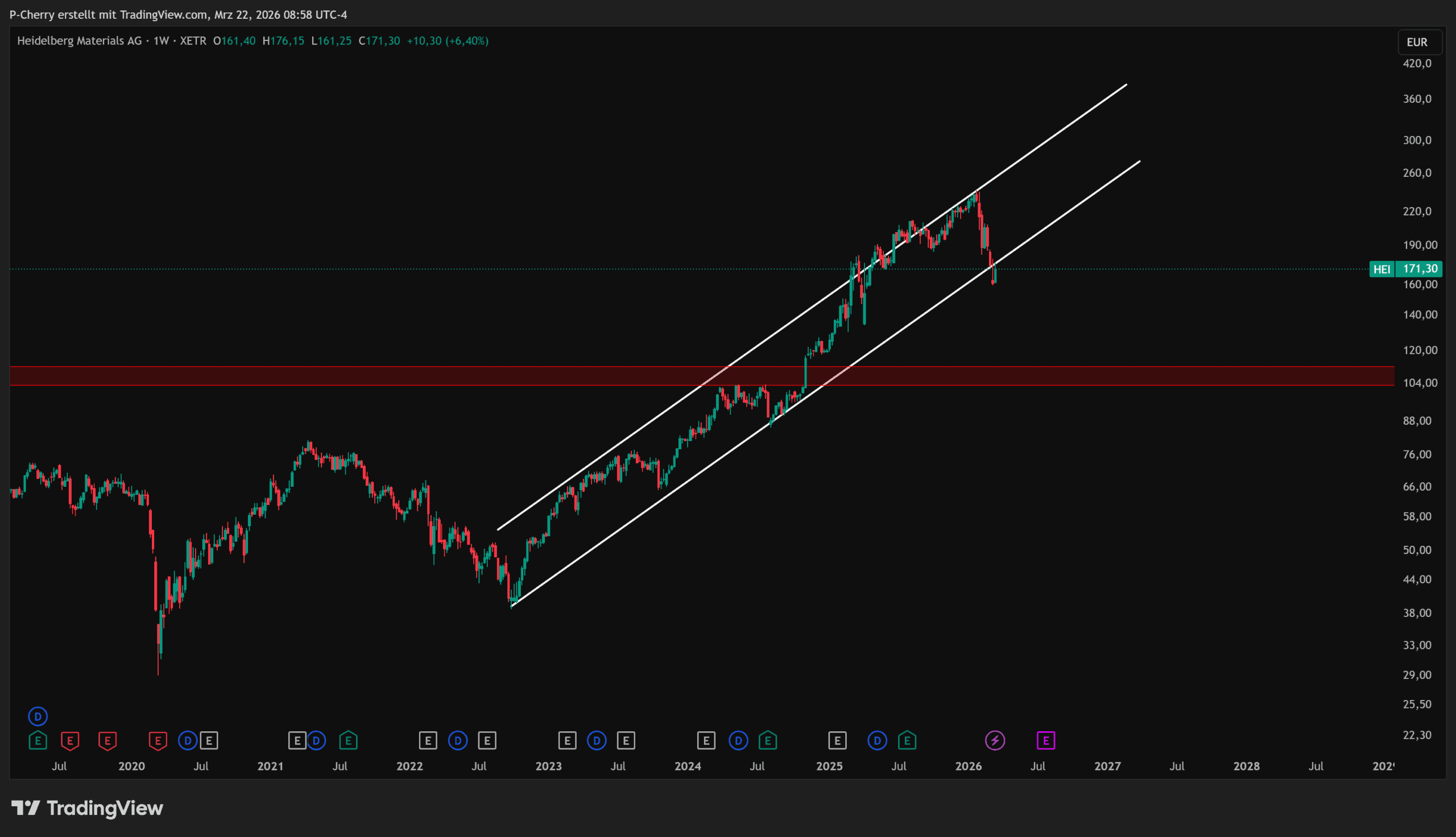 Im Wochenchart der Heidelberg Materials-Aktie lässt sich eine übergeordnete bullische Struktur erkennen. Auch wenn sich die Struktur nicht impulsiv, sondern korrektiv bewegt, ist der Wochenchart weiterhin in einem ungebrochenen Aufwärtstrend.