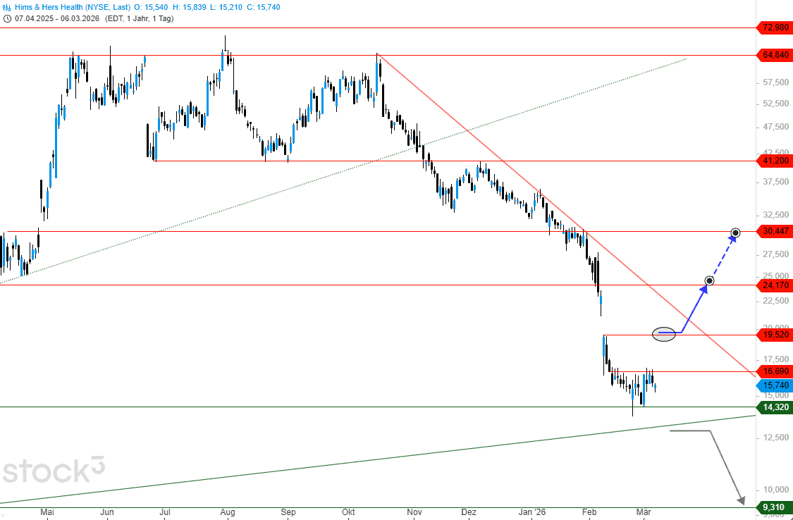 Der sich mehr und mehr beschleunigende Abwärtstrend der Hims & Hers-Aktie fand möglicherweise in der Vorwoche sein „temporäres“ Ende. Im Anschluss an die Korrekturbewegung von mehr als -80% seit dem Höchststand vom Februar 2025 bei 72,98 US$ erscheint zumindest eine Gegenbewegung möglich. Die heutige News in Verbindung mit Novo Nordisk befeuert dabei enorm!