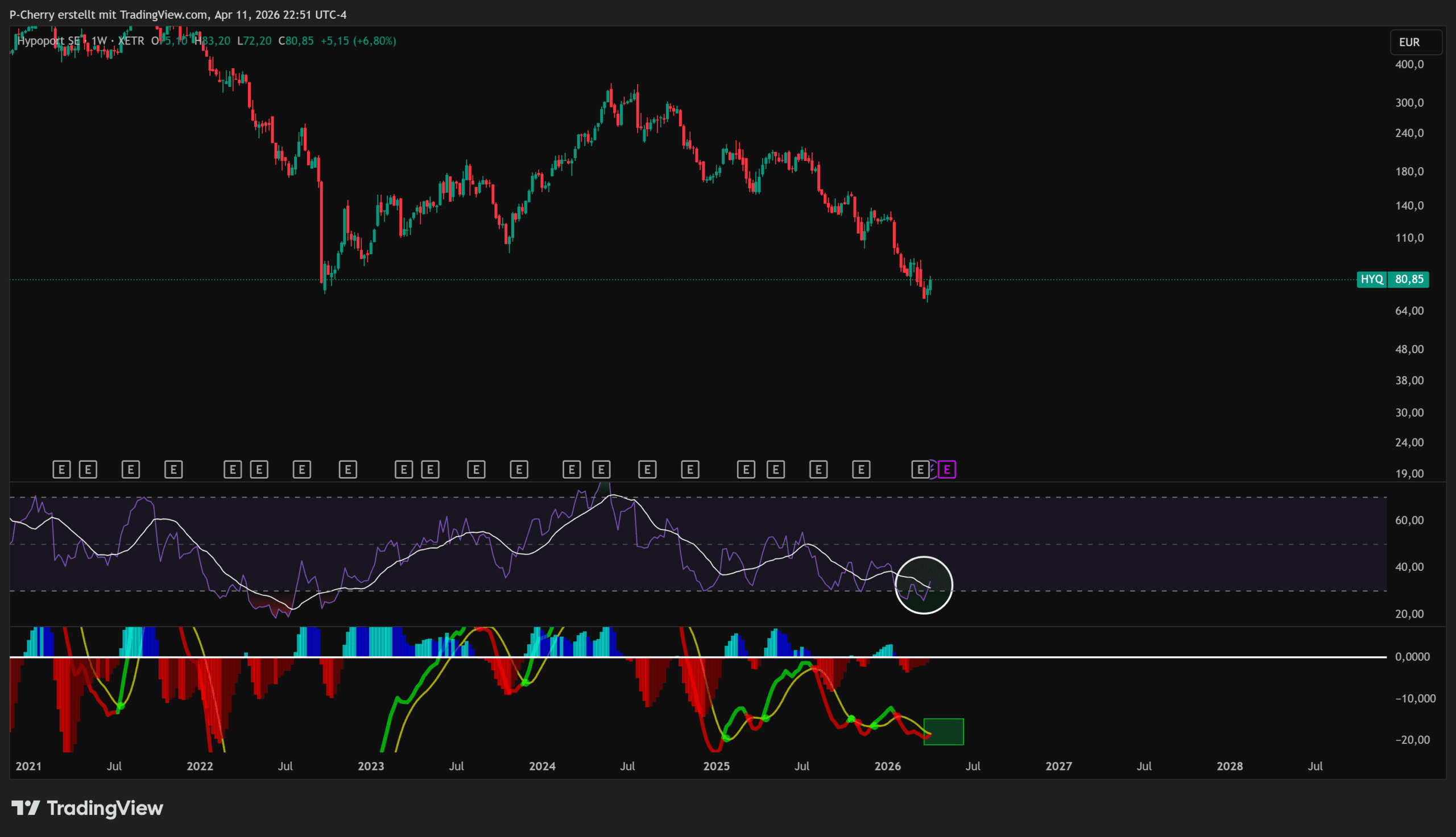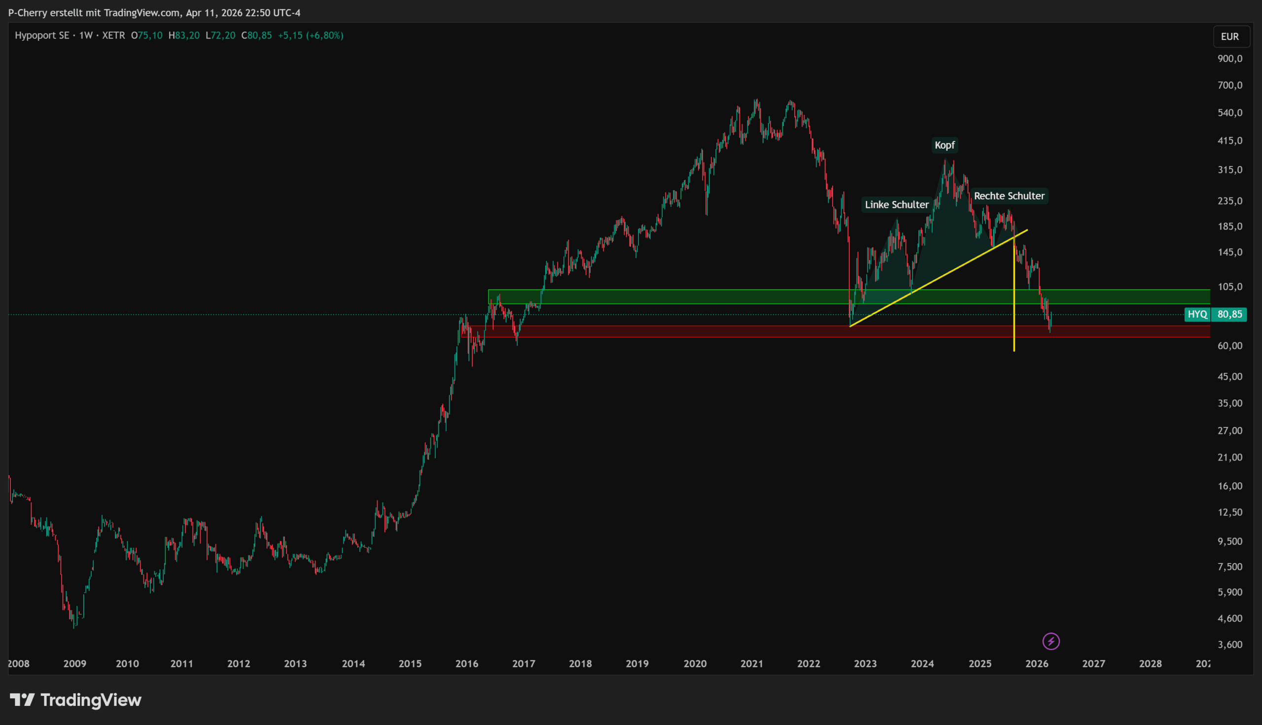 Im Wochenchart der Hypoport-Aktie zeigt sich ein deutlich bärisches Gesamtbild. Besonders ins Auge fällt eine Schulter-Kopf-Schulter-Formation, die als klassisches Umkehrsignal gilt und kurz vor der Erreichung des technischen Ziels stehen könnte. Das technische Kursziel dieser Formation liegt bei etwa 57,50 €.