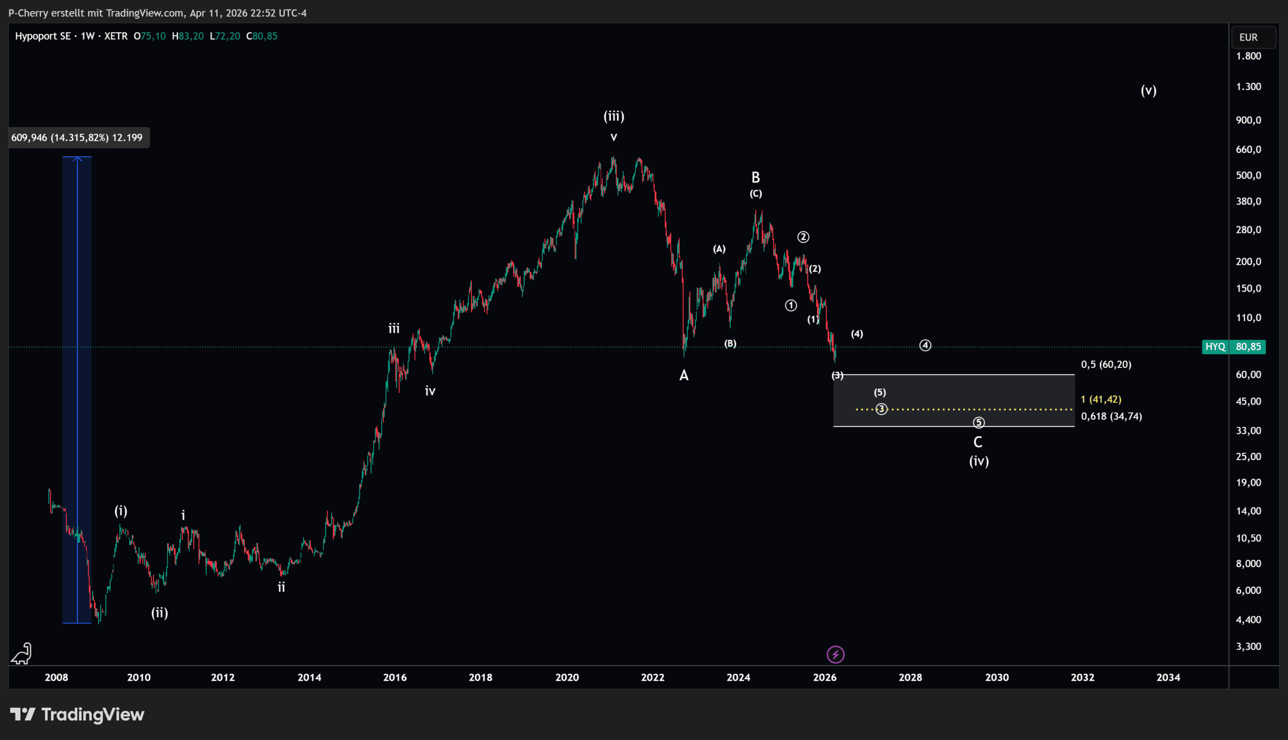 Entscheidend ist, ob der Bereich um 65 bis 73 € gehalten werden kann. Die Elliott-Wellen deuten auf eine fortgeschrittene Korrektur hin, wodurch weiteres Abwärtspotenzial bestehen bleibt.