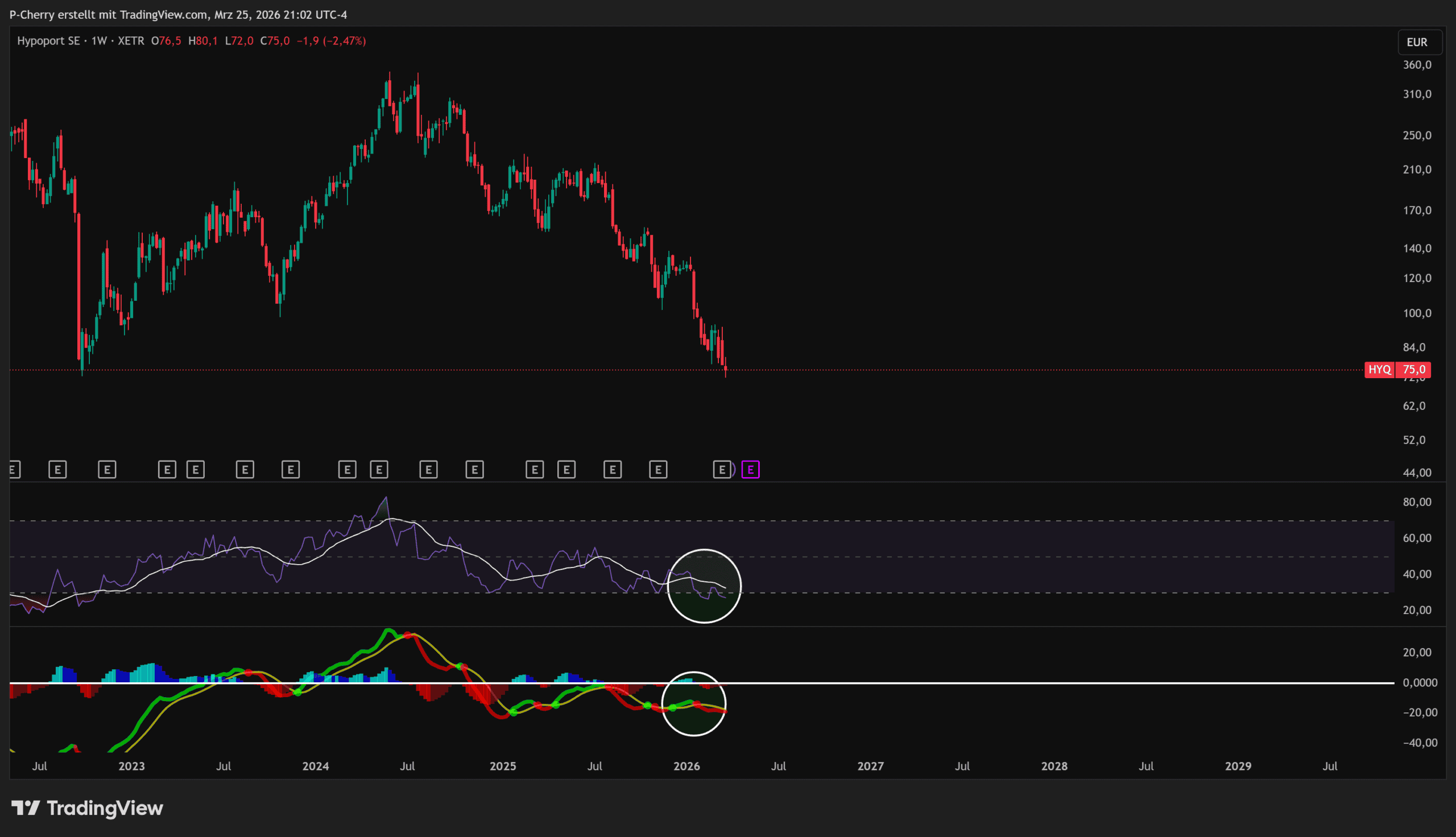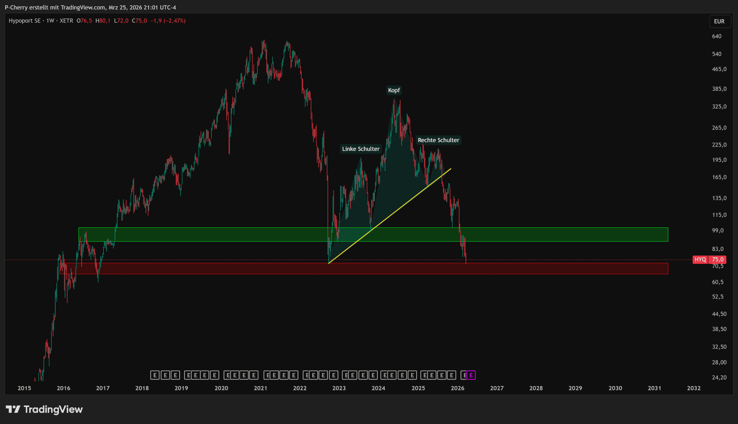 Im Wochenchart der Hypoport-Aktie zeigt sich ein klar bärisches Gesamtbild. Besonders auffällig ist die  Schulter-Kopf-Schulter-Formation, die als klassisches Umkehrsignal gilt und in Kürze nach unten aufgelöst werden könnte. Das technische Preisziel für die Formation liegt bei 57,50 €.