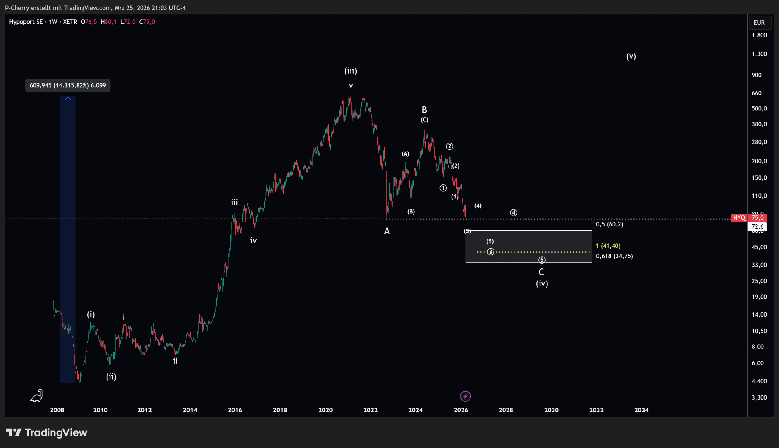 Im Wochenchart der Hypoport-Aktie lässt sich eine übergeordnete bullische Struktur erkennen. Die Topbildung im Februar 2021 bei 617 € kann als Welle 3 interpretiert werden. Der Abverkauf von besagtem Top als Rücklauf in einer Welle 4.