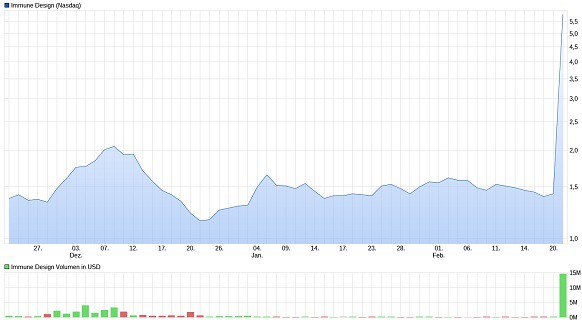 Der US-Pharmakonzern Merck & Co. schlägt bei Immune Design (WKN: A1188H) zu und will sich die Übernahme 300 Millionen Dollar, sprich 5,85 USD je Immune-Aktie, kosten lassen. Eine Nachbesserung des Angebots ist zudem nicht ausgeschlossen. Der Krebsforscher Immune Design war einer der Top-Favoriten des No Brainer Clubs und zum Jahresbeginn einer von vier No Brainer-Aktien mit einem "Stark kaufen"-Votum seitens der NBC-Experten. Das obere Ende der Kaufzone lag bei 1,45 USD.