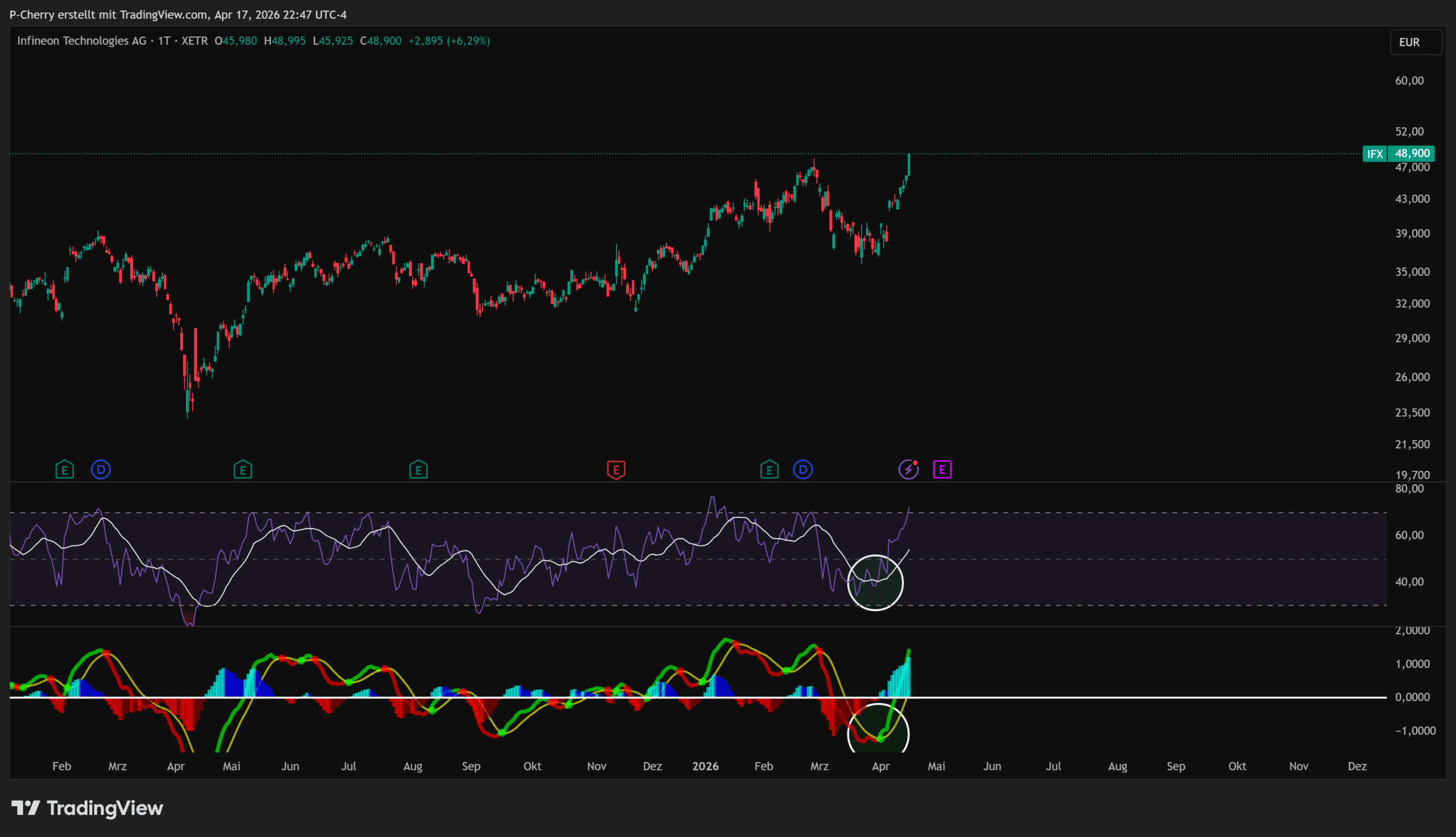 Die Indikatoren im Tageschart der Infineon-Aktie wirken aktuell bullisch. Sowohl RSI als auch MACD haben ein bullisches Crossover ausgebildet. Auch das Momentum im MACD ist ansteigend bullisch. Vorläufig sprechen diese Signale für weiter steigende Kurse.
