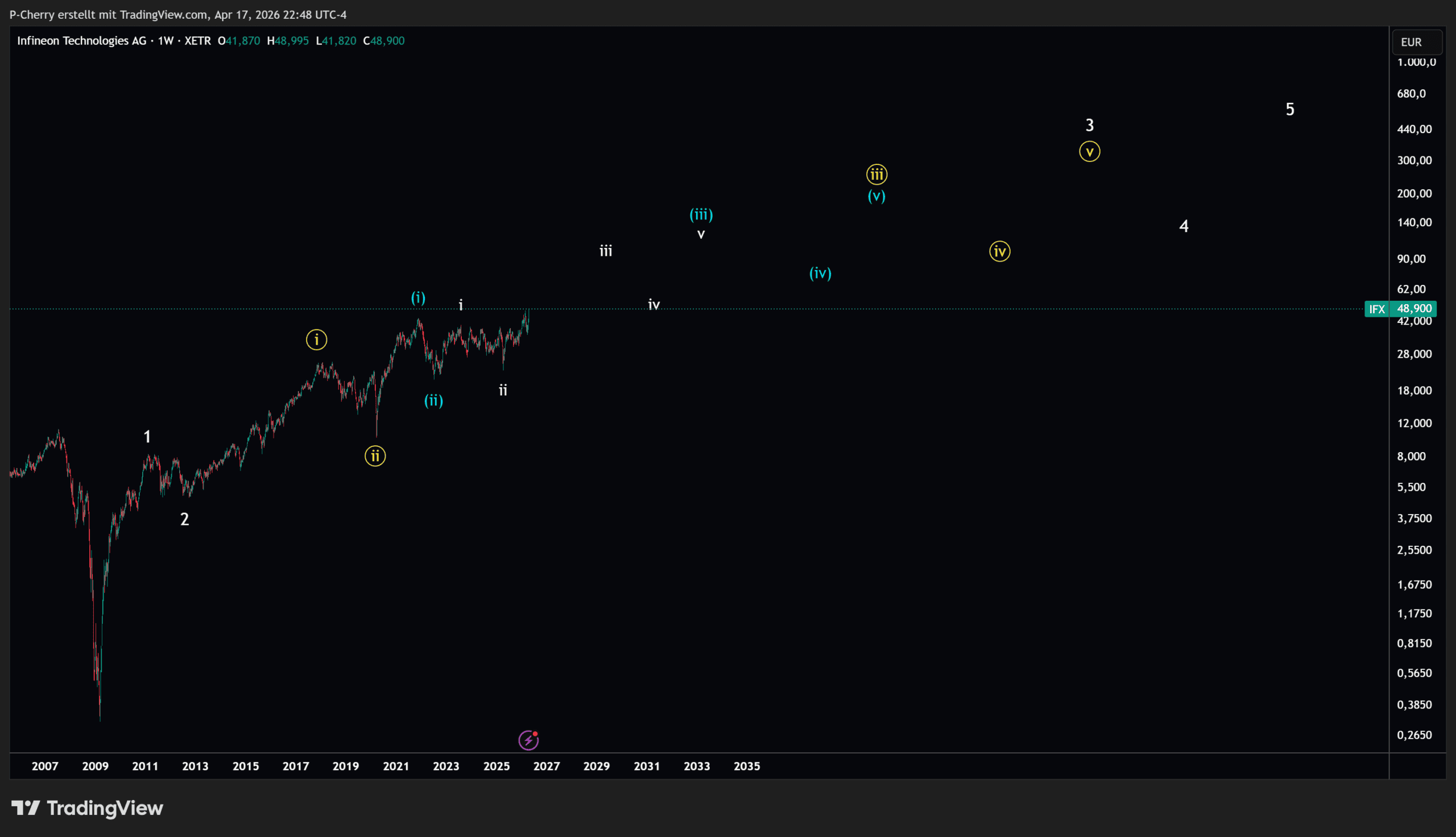 Im Wochenchart der Infineon-Aktie lässt sich eine übergeordnete Elliott-Wellen-Struktur erkennen, die sich weiterhin in einem intakten Aufwärtstrend befindet. Die erste große Impulsbewegung wurde nach der Finanzkrise abgeschlossen, gefolgt von einer Korrektur in Welle 2. Seitdem hat sich eine mehrjährige Aufwärtsbewegung etabliert.