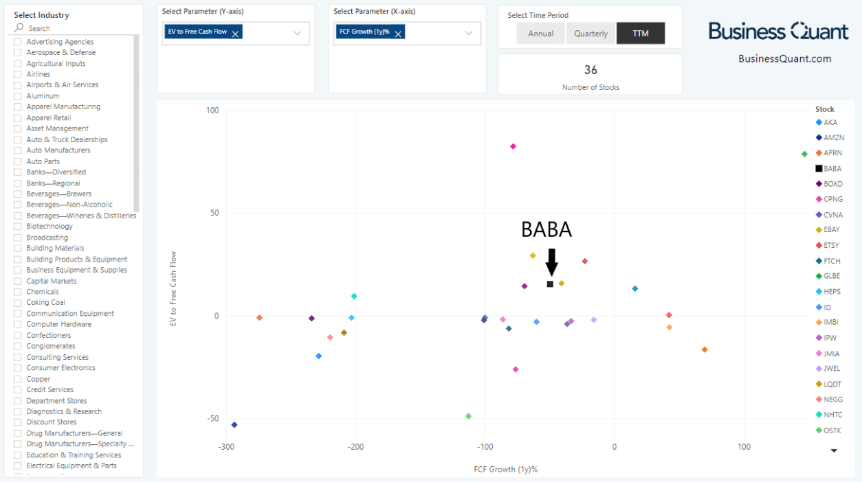 Auf der Y-Achse sind die Werte des Unternehmenswertes im Verhältnis zum freien Cashflow (oder EV/FCF) für mehr als 30 Aktien dargestellt, die der E-Commerce-/Internet-Einzelhandelsbranche angehören. Man beachte, dass Alibaba vertikal viel höher positioniert ist als ein Großteil der erwähnten Konkurrenten, was darauf hindeutet, dass die Aktie mit einem relativen Aufschlag gehandelt wird.