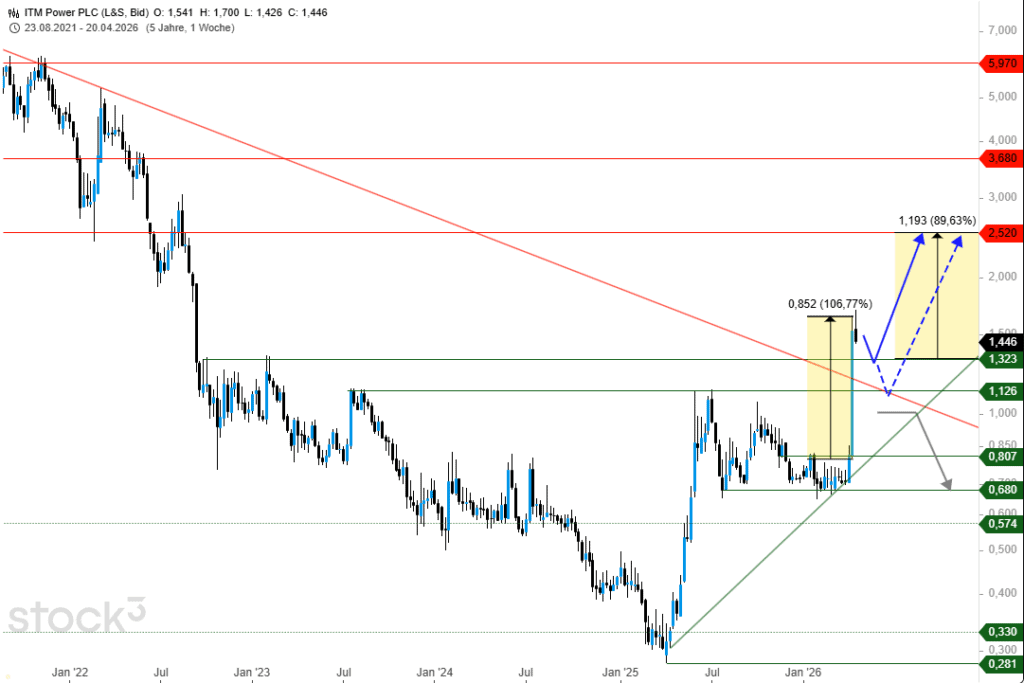 Zuletzt nahmen wir hier am 14. April die ITM Power-Aktie unter technischer Betrachtung unter die Lupe und erwarteten einen Lauf bis zur Marke von 2 €, was einer damaligen Performance von +78% entsprach. Damals knapp über der 1-€-Marke notierend, steht das zuletzt benannte Ziel der 2-€-Marke noch aus. Die Rally-Bewegung hielt dennoch weiter an, und so schossen die Notierungen allein in der Vorwoche in Summe um +107% empor.