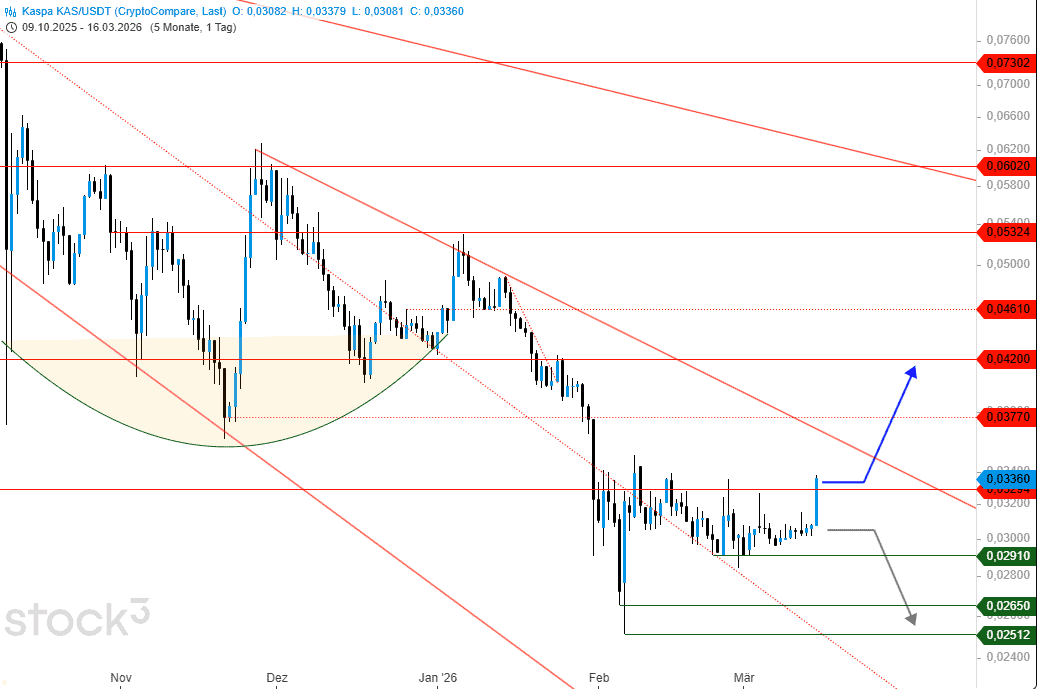 Eine schnelle Ernüchterung könnte demgegenüber einkehren, sofern Kaspa doch wieder deutlicher unter das Niveau von 0,033 US$ zurückfallen sollte. Ein Test der kurzfristigen Unterstützung bei 0,029 US$ wäre hierbei unmittelbar einzuplanen. Unterhalb davon würde sich das Chartbild wieder klar zugunsten der Bären eintrüben.