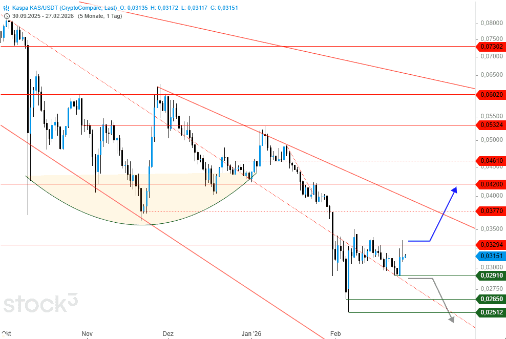 Der Preisverfall des skalierbaren Mining-Netzwerks mit Bitcoin-DNA namens Kaspa wirkt bedauerlich. So wurde bisher jegliche Art von Bodenbildungsansätzen zeitnah zerstört und dementsprechend neue Reaktionstiefs ausgebildet. Aktuell erscheint erneut die Chance einer möglichen Bodenbildung gegeben.