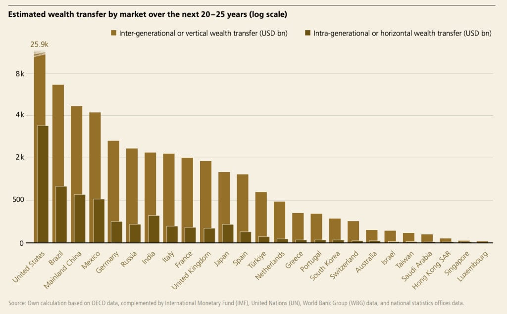 Zahlen vom UBS Global Wealth Report untermauern das Szenario. 83 Billionen US$ werden in den nächsten zwei Jahrzehnten den Besitzer wechseln. Davon gehen 9 Billionen US$ an Ehepartner, der Löwenanteil von 74 Billionen US$ aber direkt an die nächste Generation. Allein in den USA macht das über 29 Billionen US$ aus. Brasilien folgt mit 9 Billionen US$, China mit 5,6 Billionen US$.
