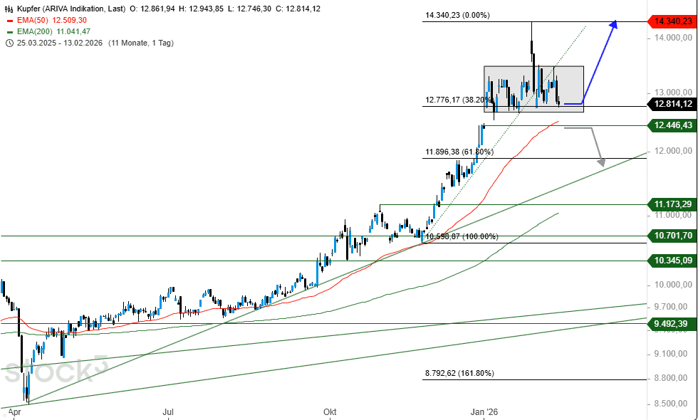 Seit Jahresbeginn befindet sich Kupfer, mit Ausnahme des Spikes für das neue Allzeithoch am 29. Januar, in einer Konsolidierungsphase. Diese kennzeichnet sich durch eine Ober- sowie Unterkante mit entsprechender Signalwirkung.