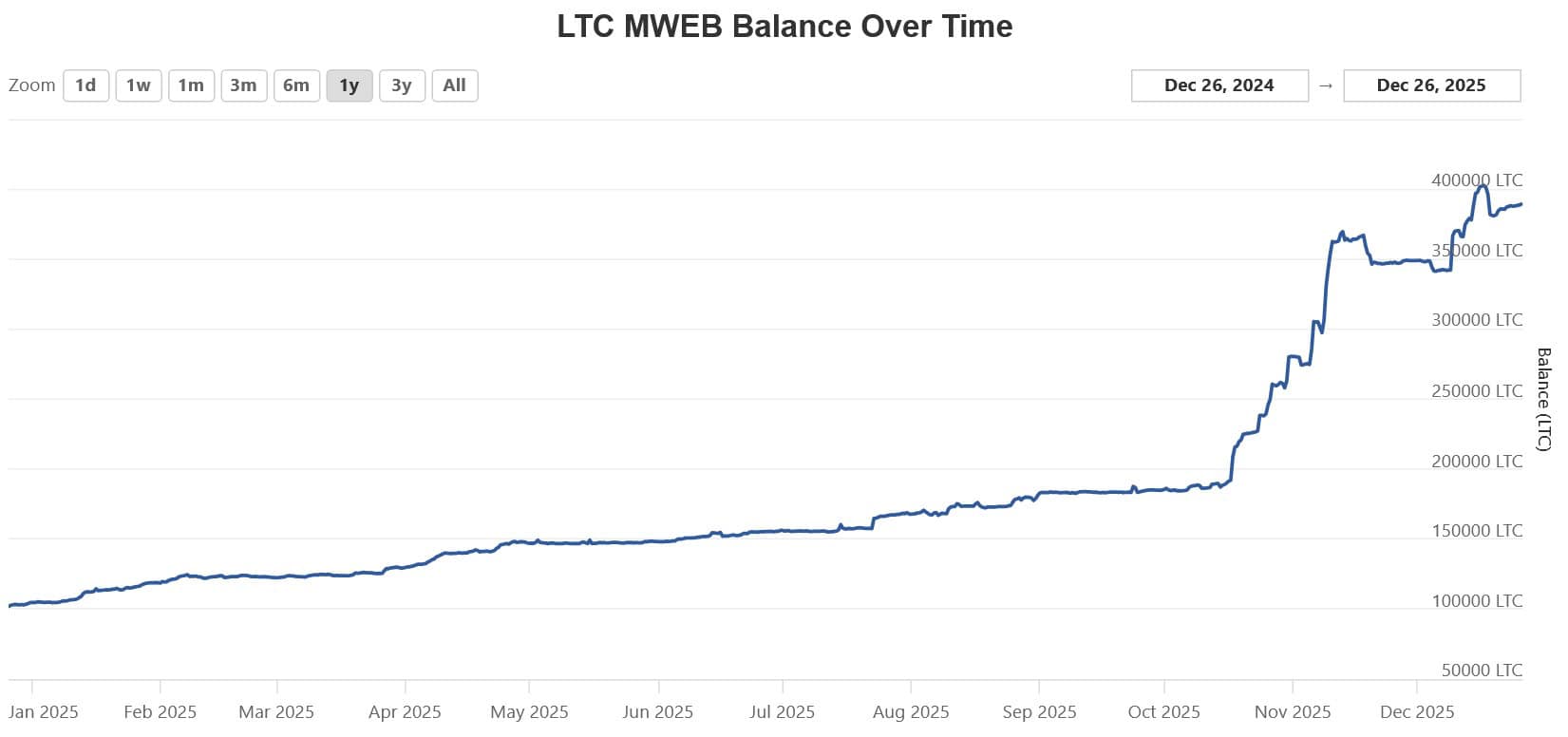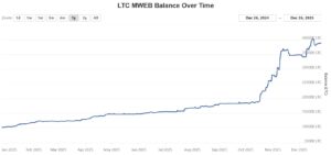 Die folgende Statistik zeigt, mit welche beeindruckender Adoption MWEB derzeit voranschreitet. Fast 400.000 Litecoins im Wert von über 30 Millionen US$ unterliegen mittlerweile der MWEB-Verwahrung – fast eine Vervierfachung seit Jahresbeginn!