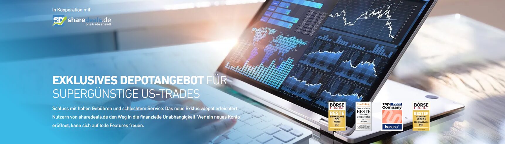 Der deutsche Online-Broker CapTrader und sharedeals.de starten ein exklusives Depotangebot. Mit dabei sind besonders günstige Konditionen und eine Sonderbetreuung. CapTrader bietet seinen Kunden den direkten Zugang zu mehr als 1,2 Millionen Wertpapieren an über 135 Börsen in 33 Ländern. Hierzu gehören Aktien, Optionen, Futures, Zertifikaten, ETFs, Optionsscheine, Währungen/Forex und CFDs. Jetzt mehr erfahren.